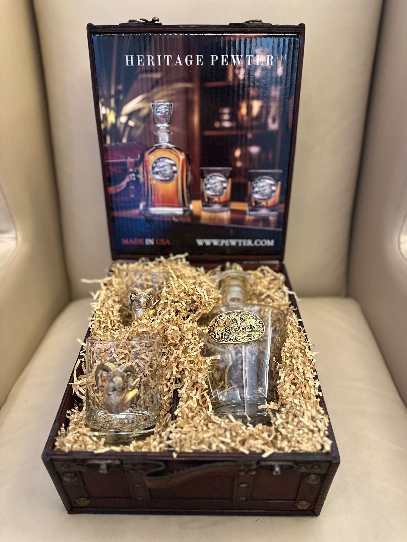This is a beautiful gold glass bighorn sheep whiskey set in a dark wood case.