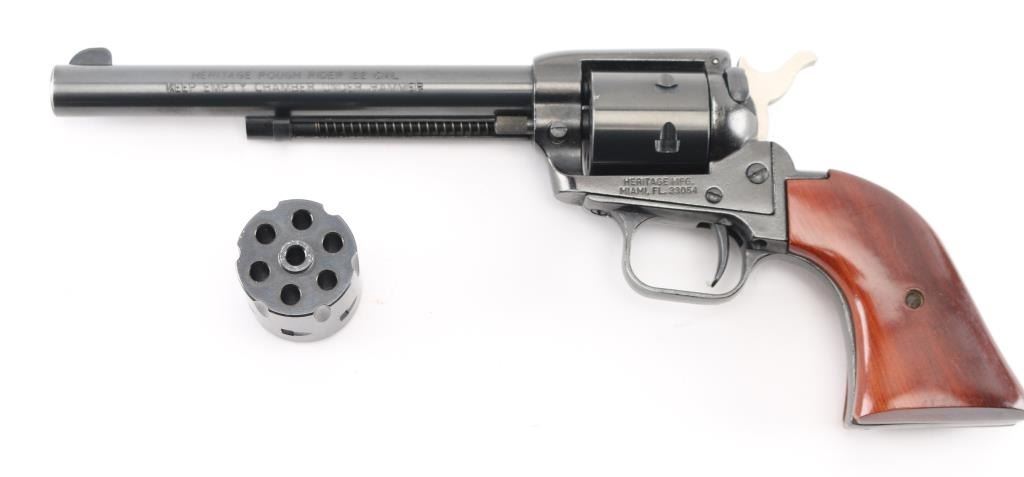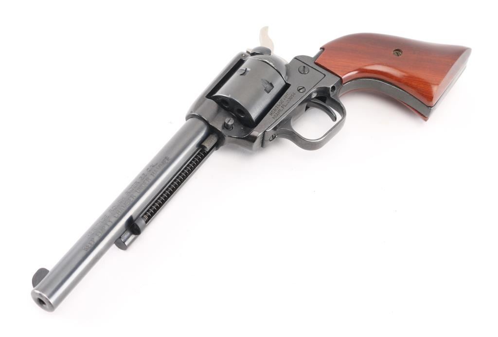 American made Single Action 6-Shot Revolver chambered for .22 LR. Comes with fluted .22LR cylinder, 6.5" black barrel with a blade front sight and integral rear sight, smooth curved trigger and serrated hammer spur, safety on the left side of the hammer with spur and two piece red wood grips. Metal finish looks good with some scratches and edge wear. Wood grips look very good. Bore is excellent and bright. Comes with extra 6 shot 22 Magnum cylinder, holster with belt. NRA Condition is Excellent.. Modern Firearm.