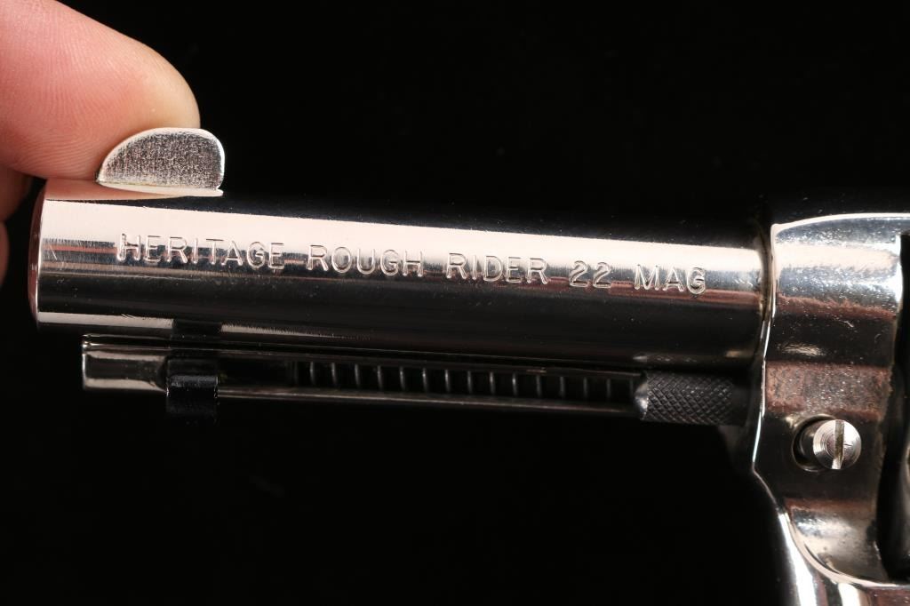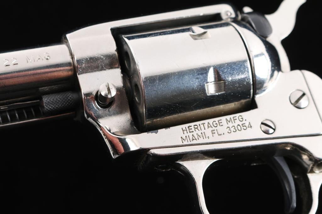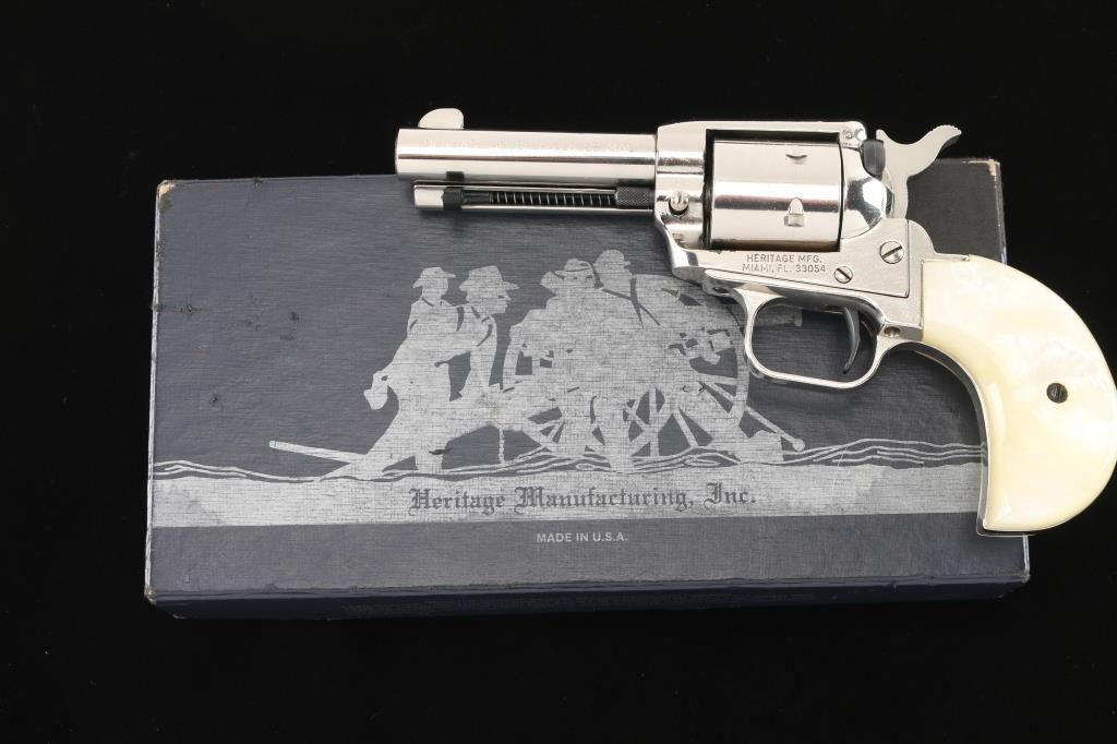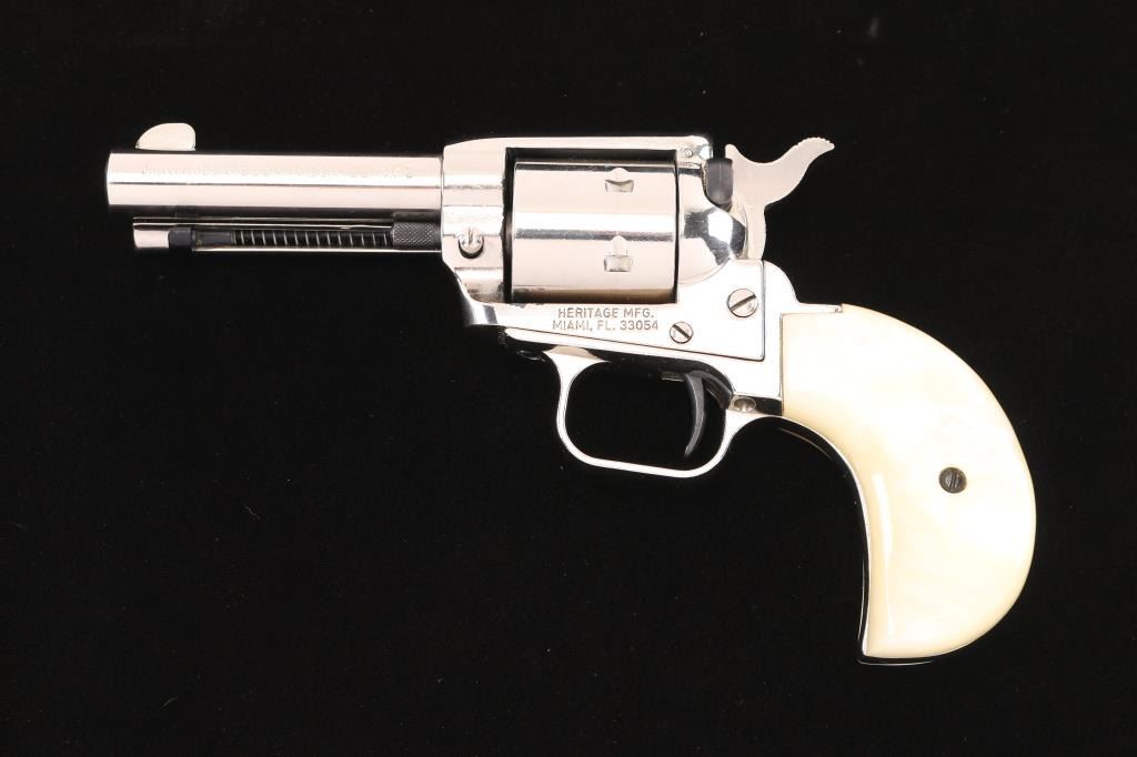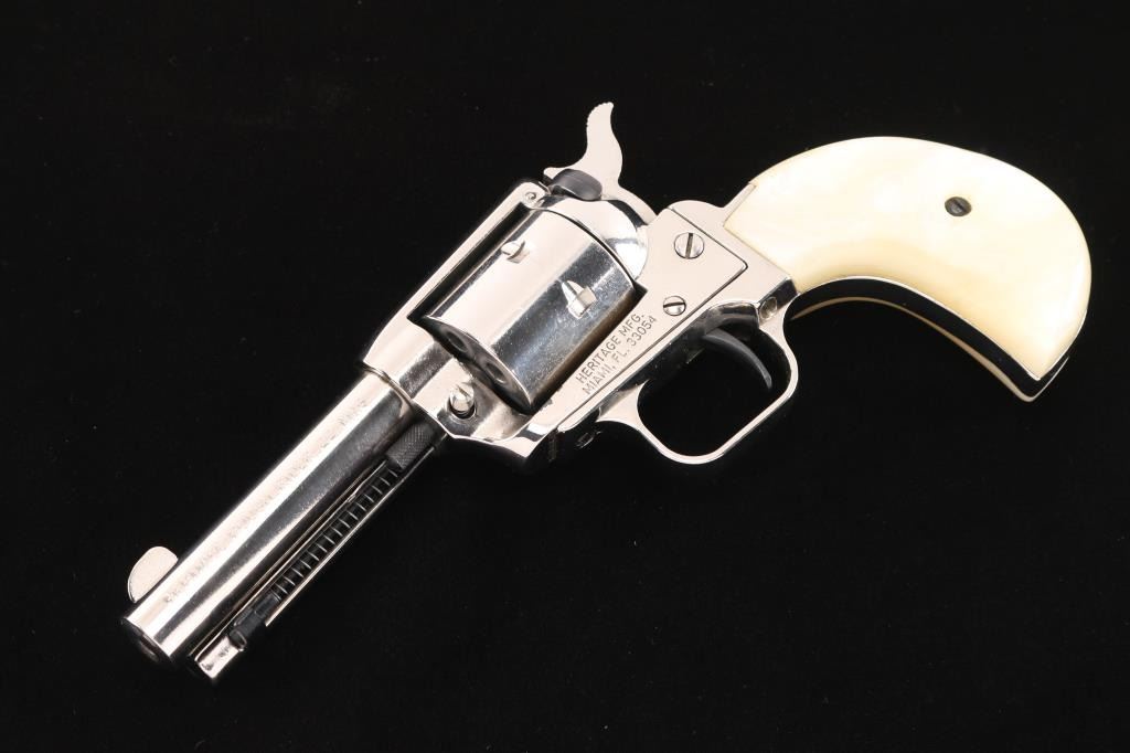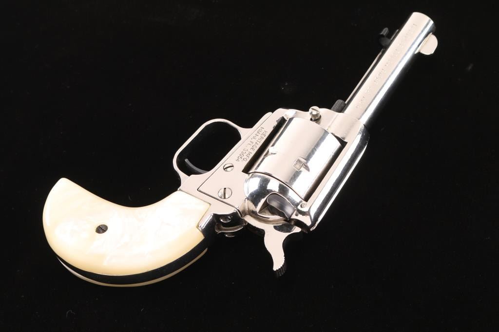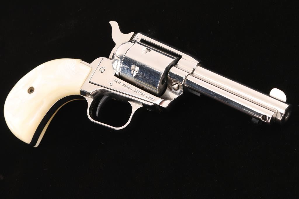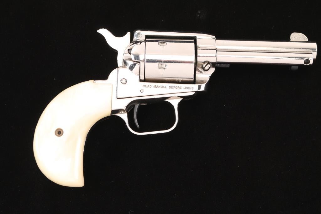 Made in the style of the Colt model 1877. 6-shot, single-action revolver. Nickel finish, blued hammer, cylinder pin, safety and extractor rod. White plastic faux mother of pearl Birds Head grips. 3 3/4" barrel with fixed sights. Bore appears excellent/bright. Action is tight, and cylinder indexes properly. smooth .22 Mag. cylinder on revolver. Nickel finish is about 97% with minor scratches. Grips are excellent. Comes in original factory box with matching label and paperwork.NRA Condition-Excellent. Modern Firearm.