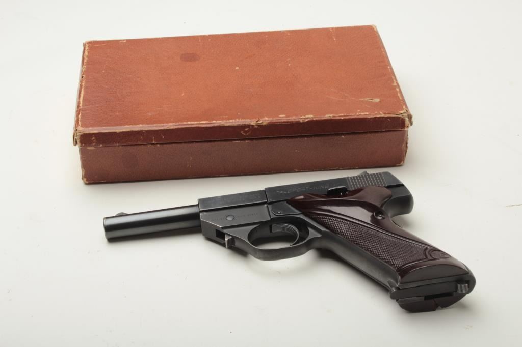 Hi-Standard Sport King Model semi-automatic pistol, .22LR caliber, 4.5” barrel, S/N 346167, blued finish, checkered plastic grips in overall very good condition showing the majority of its original blue finish, very good bore and markings, grips show a crack and a chip on the right side grip at the rear base; accompanied by a factory cardboard box with correct end label. (C&R/PPT). Est.: $150-$300.
