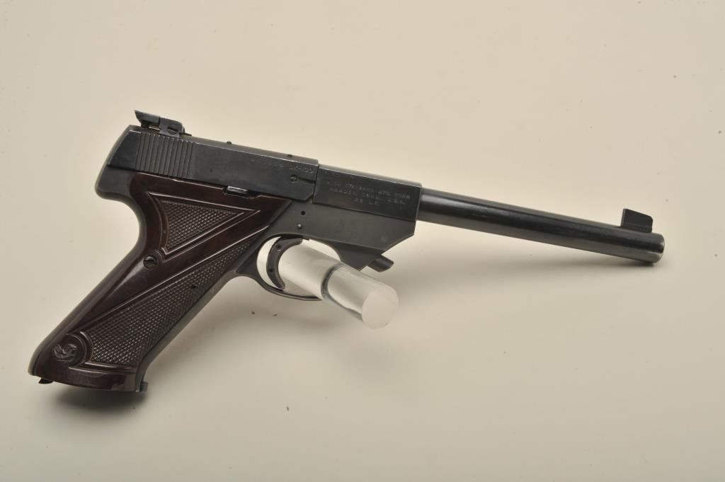 finish, checkered maroon target grips, S/N 460554, in overall very good + condition showing majority of original blued finish with some holster and high point wear; very good bore, crisp action, sharp markings and very good grips. (Modern/PPT). Est.: $200-$400.