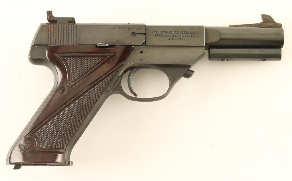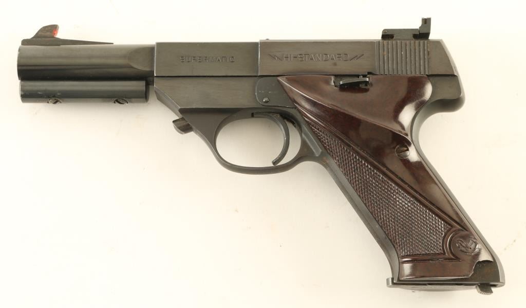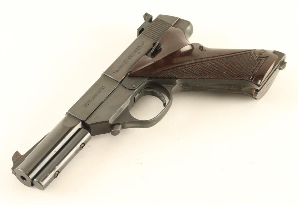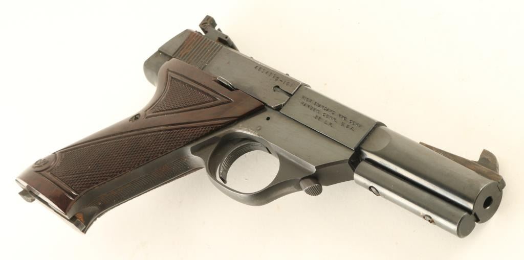 Semiautomatic rimfire pistol features blued finish, checkered brown plastic grips (thumb rest for right handed shooter), 4.5" barrel, adjustable sights, manual safety, heel magazine release, weights under barrel. Bore is very good condition. Retains 85% blue, some bare metal on edges & corners, small area of light surface rust around rear sight nd rear of slide. Grips are good functional condition, chipped out piece at bottom rear of left grip. Condition is NRA Very Good *** C&R Firearm ***