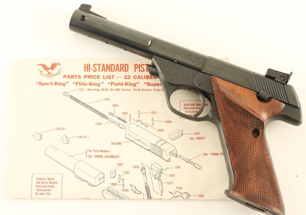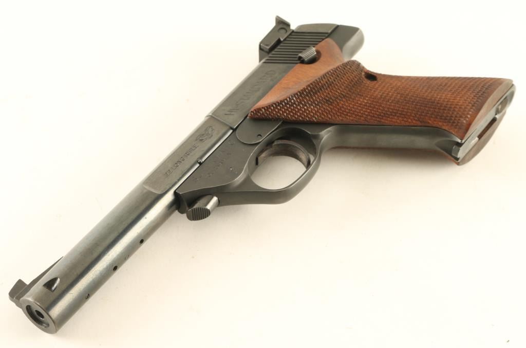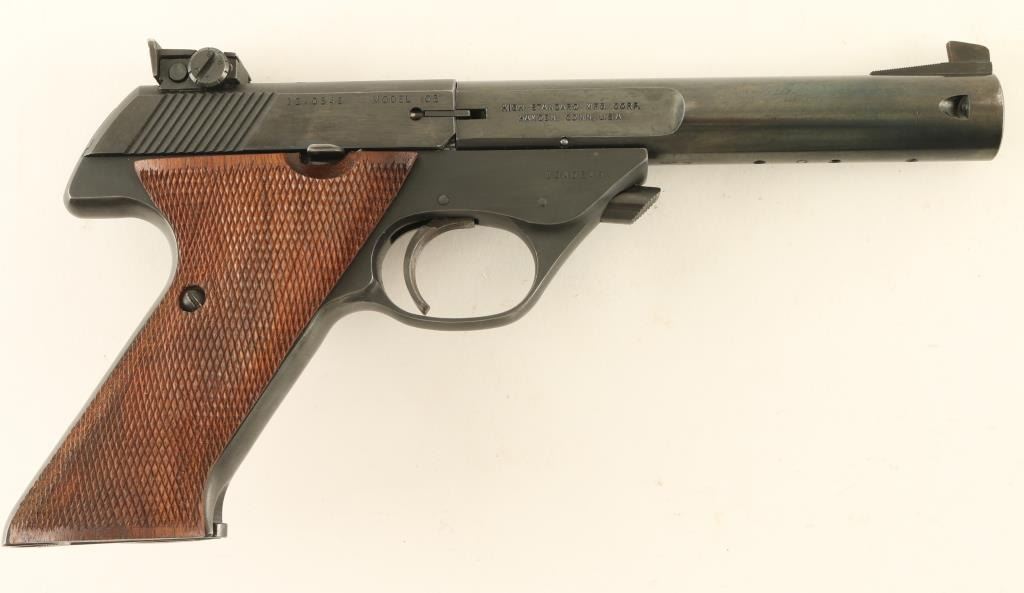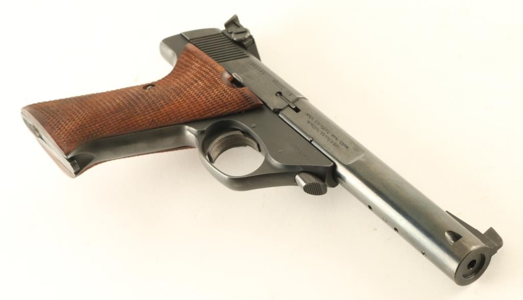 SN: 1340549 'Model 103' Semiautomatic rimfire pistol features blued finish, checkered wood grips with right handed thumb rest, 5.5" barrel, adjustable sights, manual safety, heel magazine release. Bore is excellent. Retains 95% blue with few lines of bare metal showing on sharp edges. Grips are very good. Includes one magazine, manufacturer's parts sheets. Condition is NRA Excellent *** C&R Firearm ***