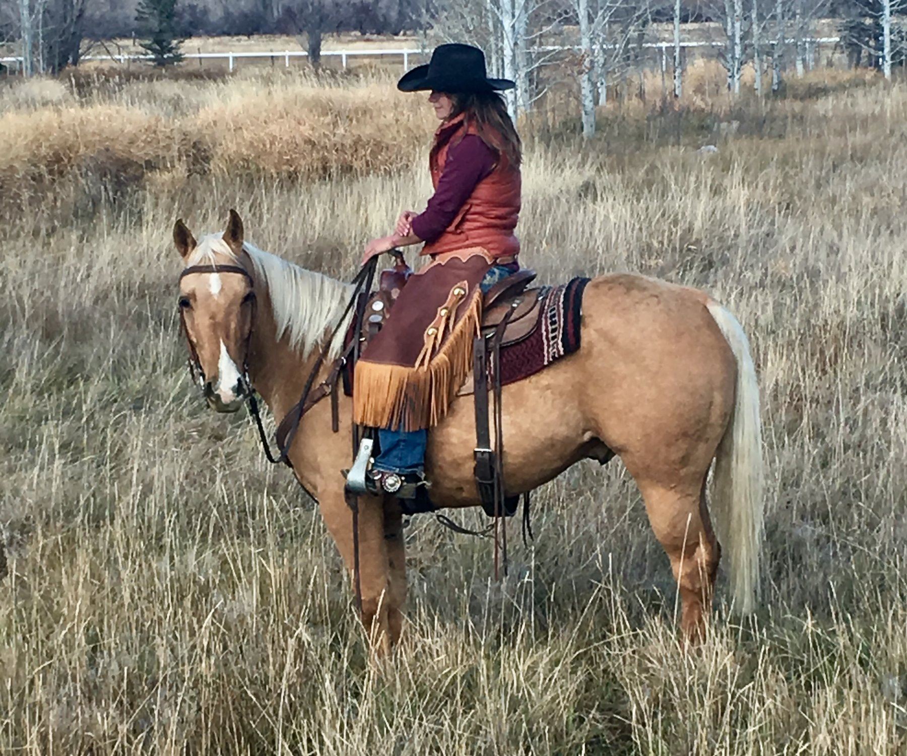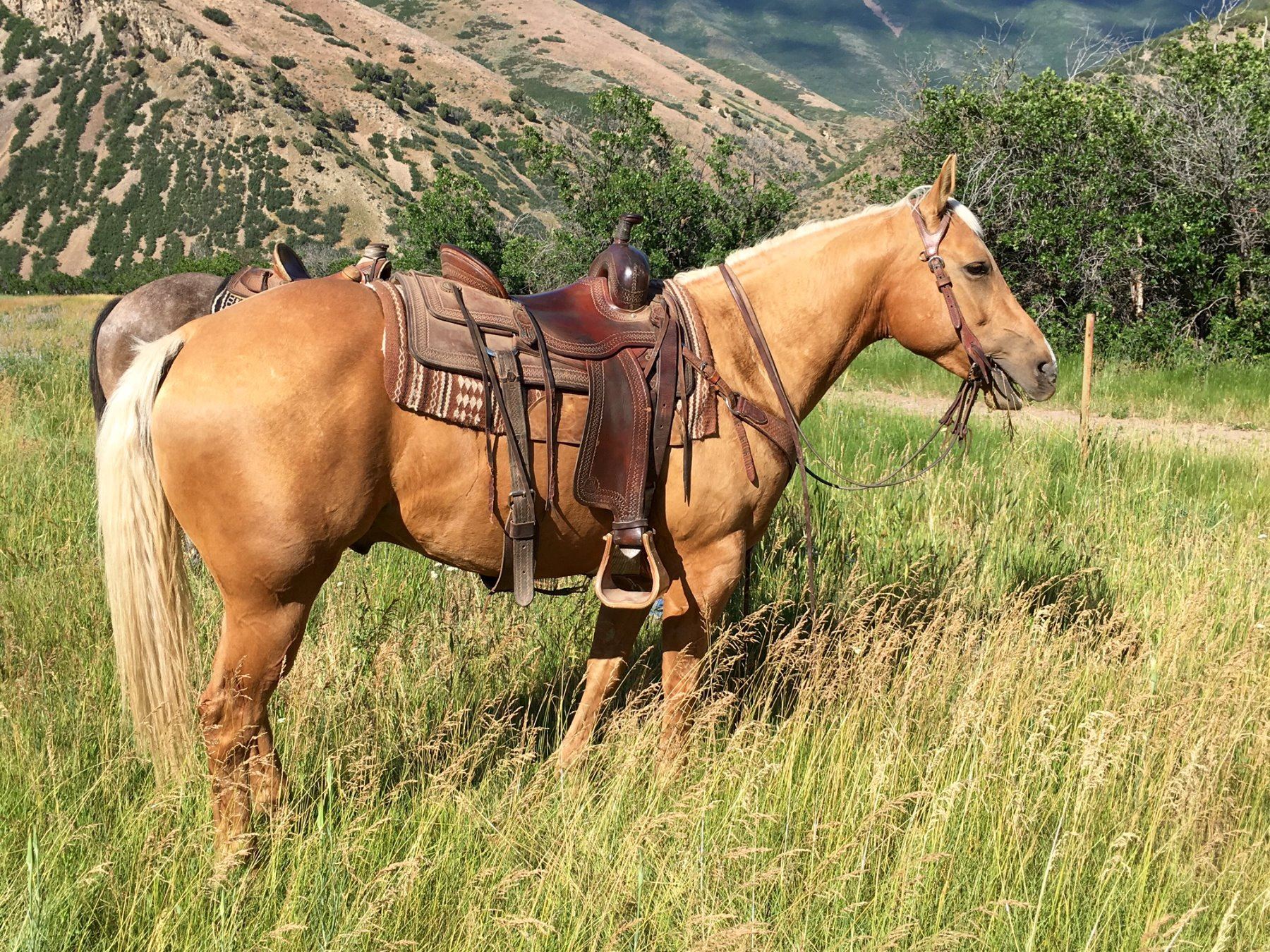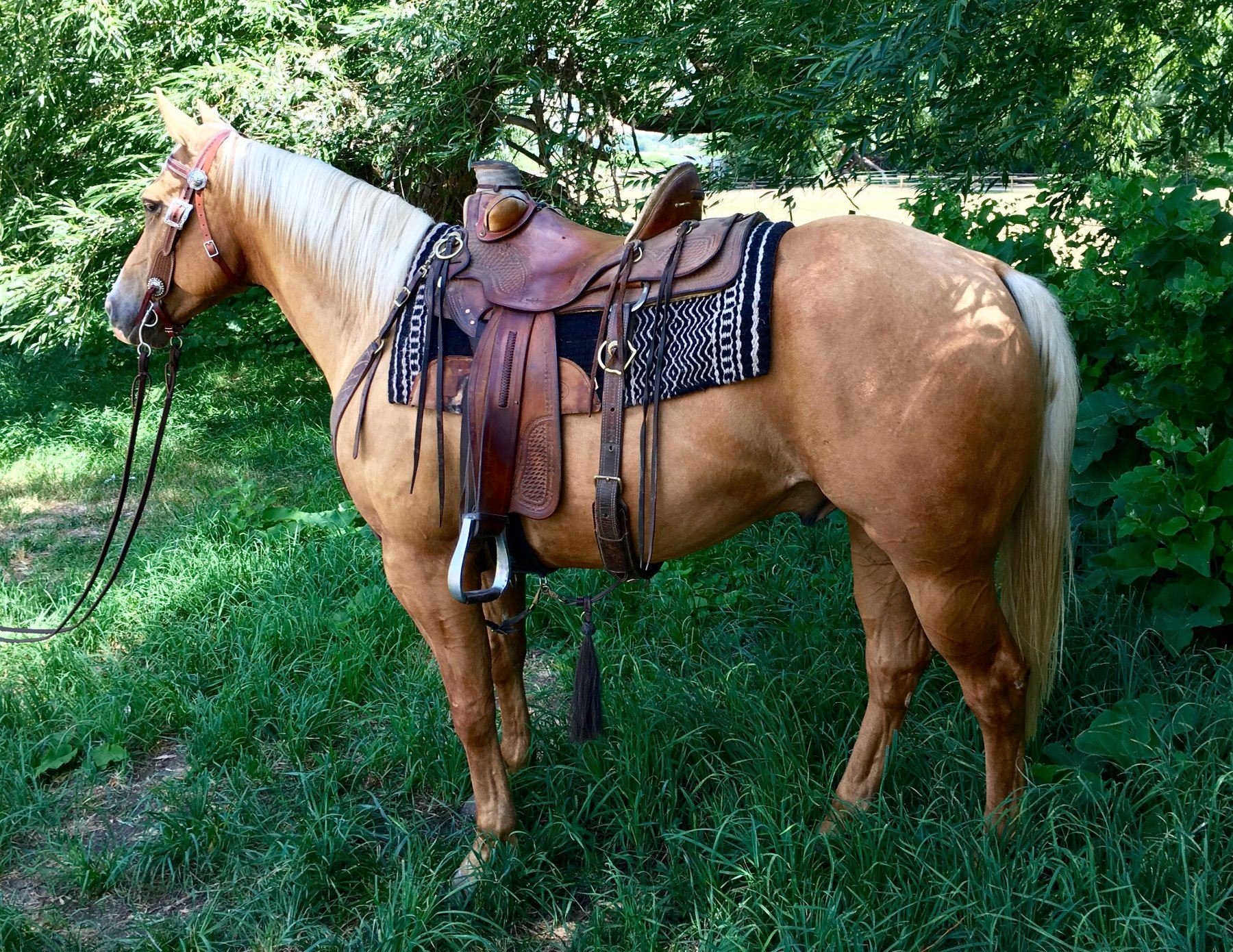 Nugget has been with us since he was two years old, he's a superb gelding- quiet, easy to get along with, wants to please. He rides with style and looks as good as they get. Big hip, great build and is very willing and easy to train on, oh yeah and he's palomino. He's got a good stop, lopes a pretty circle, he's been around cattle and has done some team sorting. He's full of talent and has the brains that makes him very likable. He stands 15 hands. This is one heck of a nice gelding and will befor a long time. He really is an all around gelding and would make a nice rope horse prospect,he's been great as a ranch horse and one to take to the mountain. He's been in good hands from the start and is bred to perform. Sound and Sane with no buck. Bred the best- Smart Little Lena, Peppy San Badger, Docs Hickory, Mr San Peppy