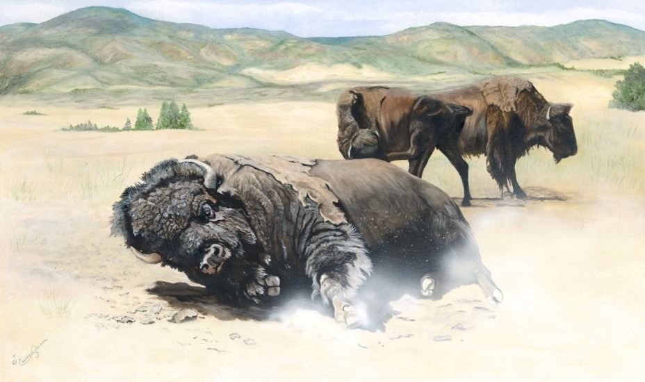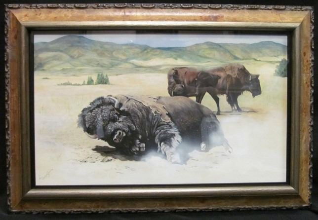 “High Noon” – with a loud grunt, the old bison drops his body into the wallow. The dust and scrubbing often help remove loose hair and insects. It is high noon and the small herd is seeking relief from the burning sun of Colorado. This original water color measures 17-1/2” x 26” with custom framing by Shenandoah Framers, Lexington, VA. DEF wishes to thank Carolyn German for this 100% donation. Carolyn German, 540-463-3878, germanwoodsstudio.truvistaspace.com.