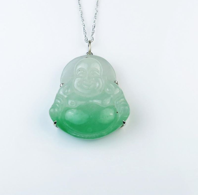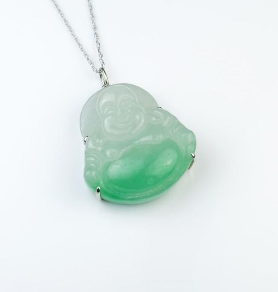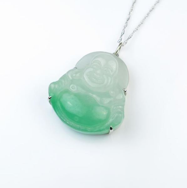 Carved in apple green to white jade weighing over 80.00 carats (16 grams) set in 18K white gold custom made setting.