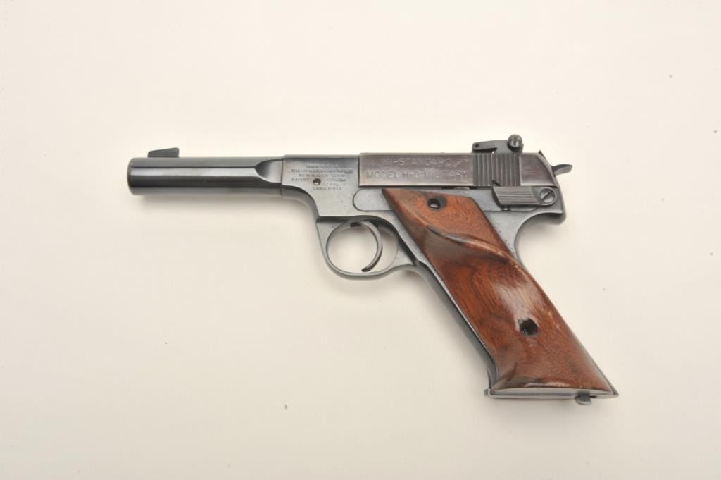 High Standard Model H-D Military semi-auto pistol, .22 LR caliber, serial #276183. The pistol is in very good to nearly fine overall condition with a 4 ½” barrel. The pistol features a ramp front and adjustable rearsights. The pistol retains nearly all of its blued finish with high point edge and muzzle wear. The smooth, oversize target grips are in good condition with small mars and loss of finish. The pistol comes with one correct magazine. The bore is good, the action crisp and markings are sharp on this desirable High Standard. Est.: $250-$500. (C+R).