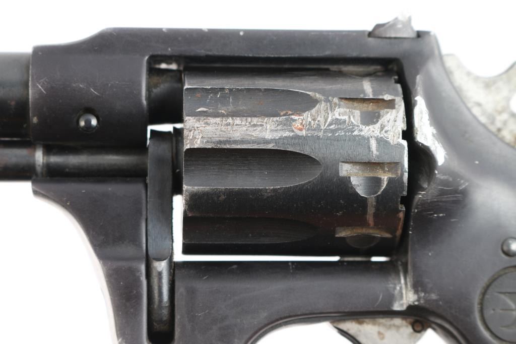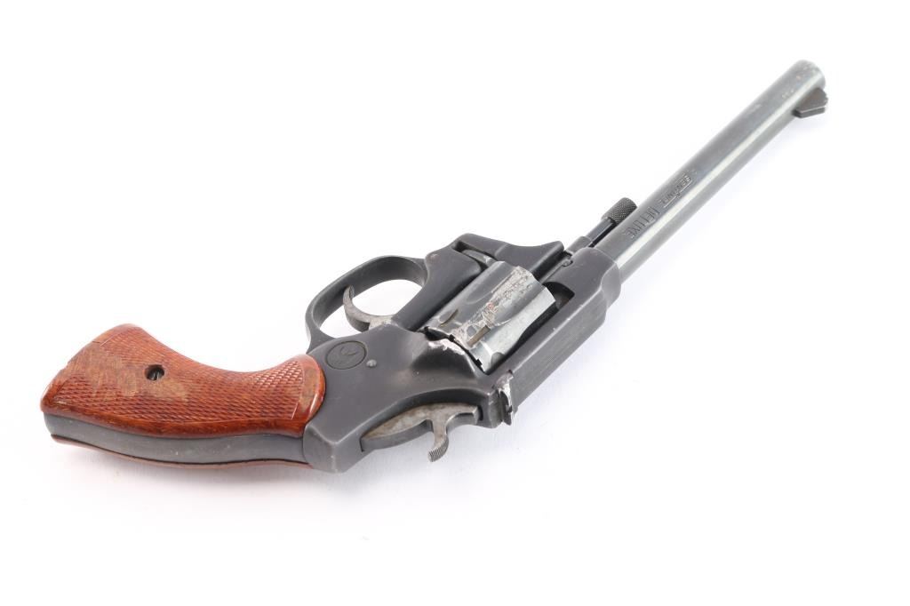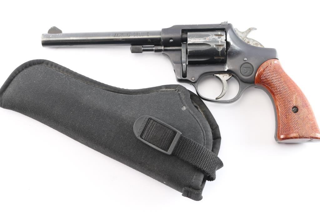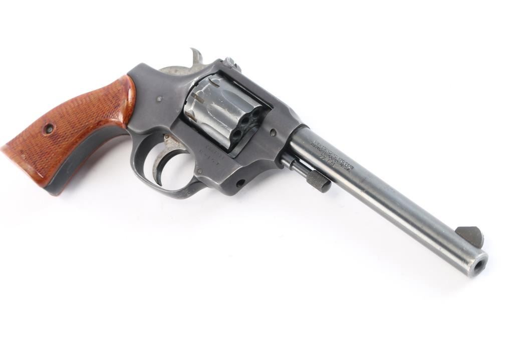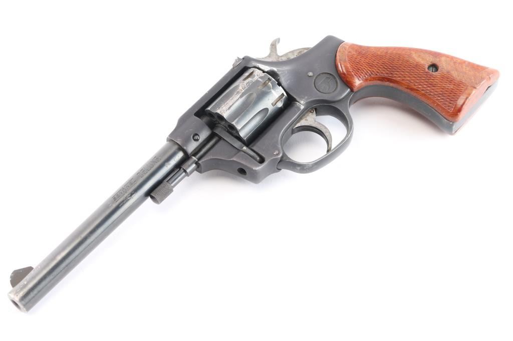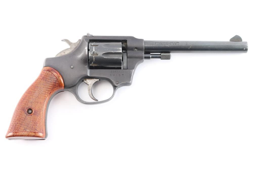 #2067911 Double action nine-shot revolver chambered for .22 Short, Long or Long Rifle. Manufactured in Hamden, CT circa 1969 (“EM” of “FM” barrel date code). Features a blued finish, pinned 6” round tapered barrel, serrated ramp front sight, dovetailed rear sight with square notch, serrated curved trigger, serrated hammer spur, fluted swing-out cylinder, non-shrouded ejector rod, black finished alloy frame, and checkered faux wood plastic grips. Includes an Uncle Mike’s Sidekick black nylon OWB holster. Revolver retains approximately 80% of its original finish showing edge wear, some scattered rust, and the left side of the gun bearing scrapes & gauges. The action is mechanically sound with proper indexing & solid lock-up, the bore is very good, and the plastic grips are good with small chip out of the butt & scrapes on the left panel.