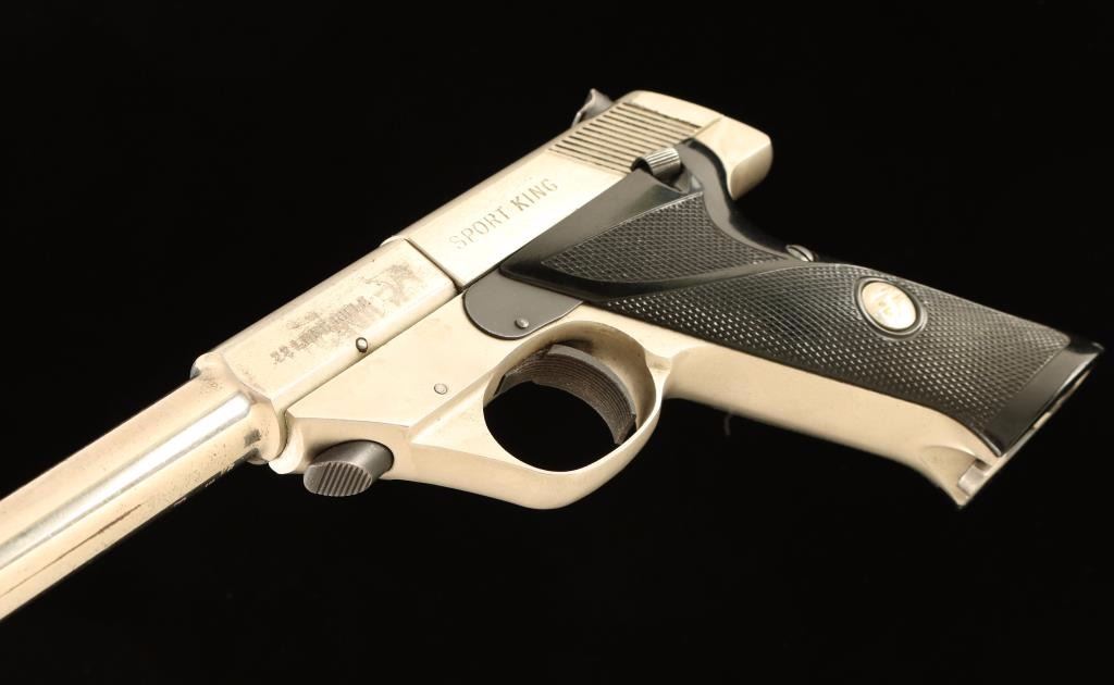 Nickeled, semi-automatic, single action pistol with a 6-3/4" barrel, blued; trigger, hold-open, safety and takedown and mag release, plastic grip panels. Plating is wearing through on edges and high points. Plating on frame is matte finish. Bore is shiny with good rifling. Action works well. Grips are with 3 small chips out of the bottoms. *Modern Firearm*