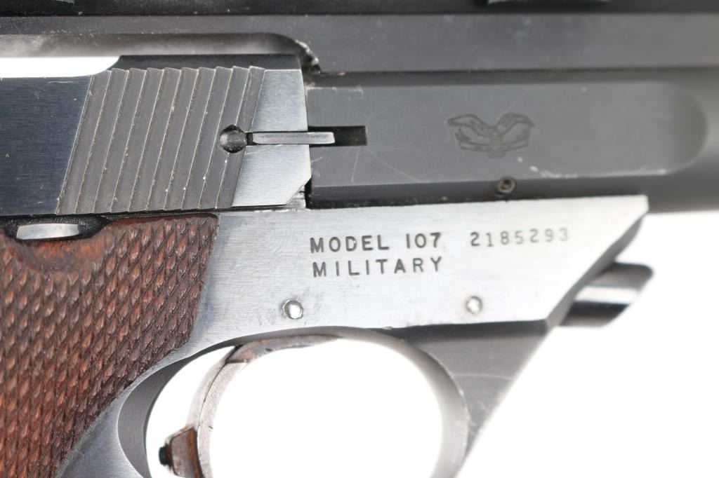 SN: 2185293. 'Model 107 MILITARY' Semiautomatic rimfire pistol features blued finish, checkered wood grips with right handed thumb rest, 5.5" bull barrel with rear scalloped flats, recessed crown, drilled & tapped under barrel for weights, adjustable rear sights, front sight removed. manual safety, toe magazine release. Bottom 2/3 of grip straps have been stippled. Manufactured 1969. Bore is excellent. Retains 92% blue with light edge losses, minor scratches. Grips are very good. No Magazine. Mounted with a Simmons Shot Dot, red dot scope in good working order. Condition is NRA Very Good. C&R Firearm.