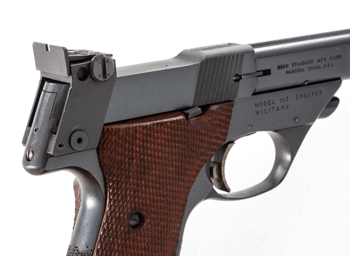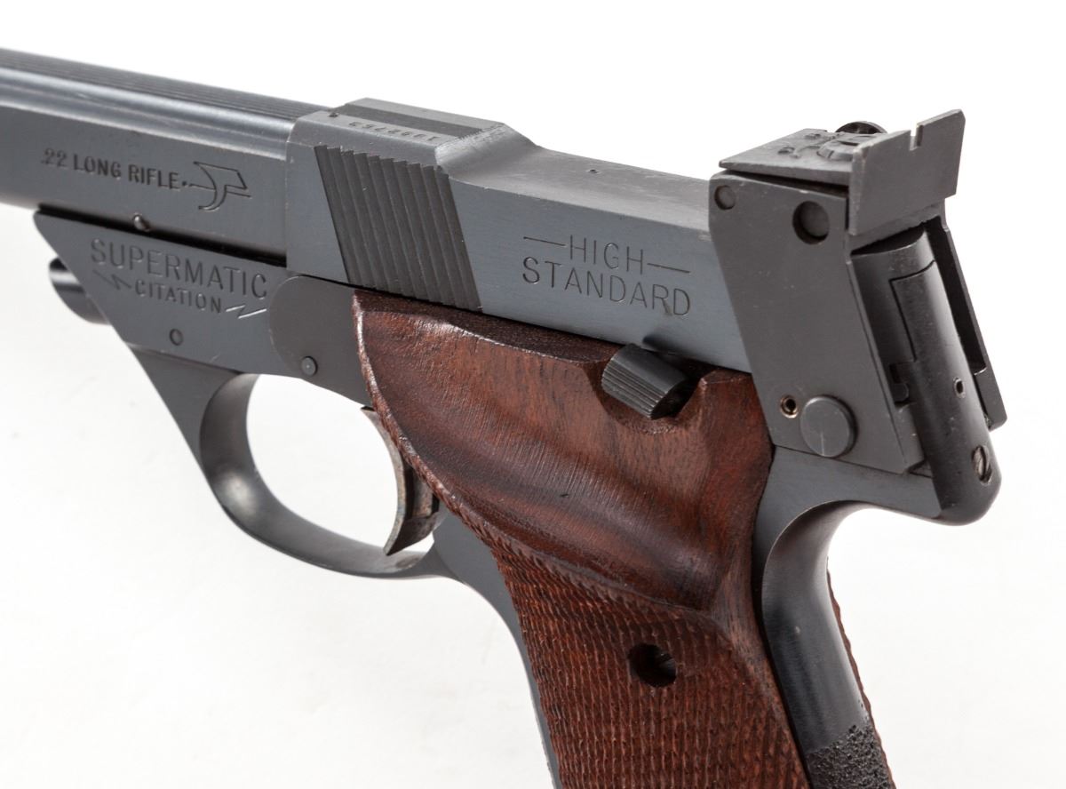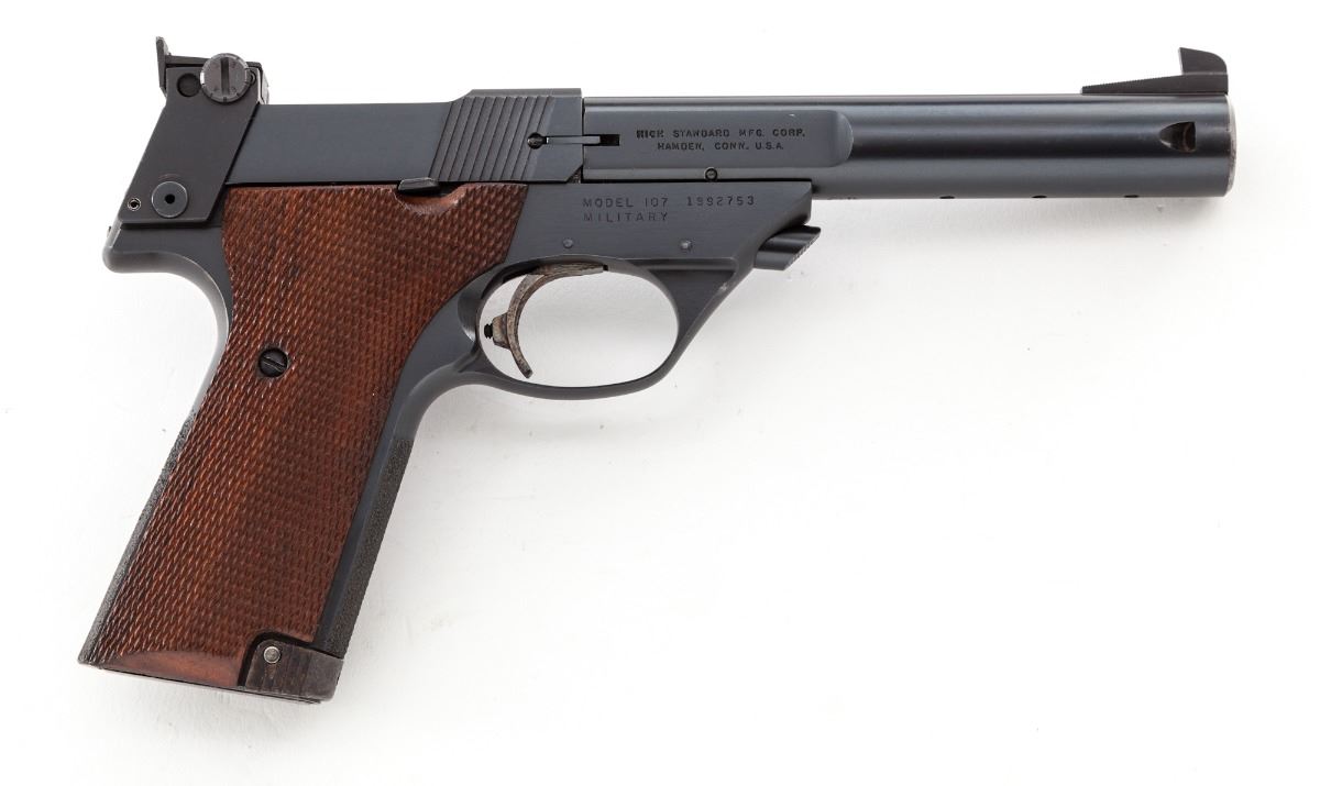 High Standard Supermatic Citation Series 107 Semi-Automatic Target Pistol, #1992753, .22 LR cal., 5-1/2'' barrel, blue finish, factory checkered walnut grips, with one factory magazine. Condition is excellent, appearing as new, showing little if any use, and only mild thinning in actioning areas. Est.: $500-$750. (Modern)