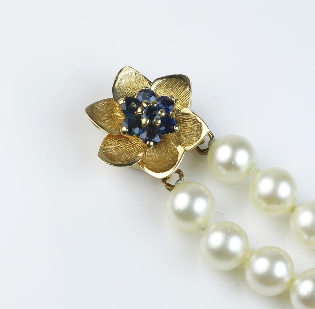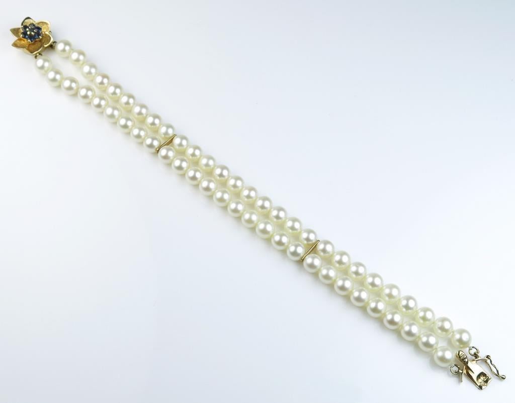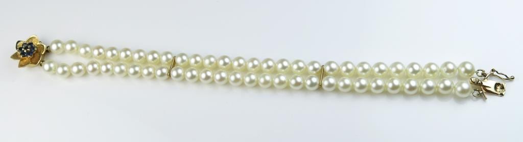 High quality ladies double row cultured pearl bracelet with nice 14 karat yellow gold sapphire clasp. Estimates $800-$1,200
