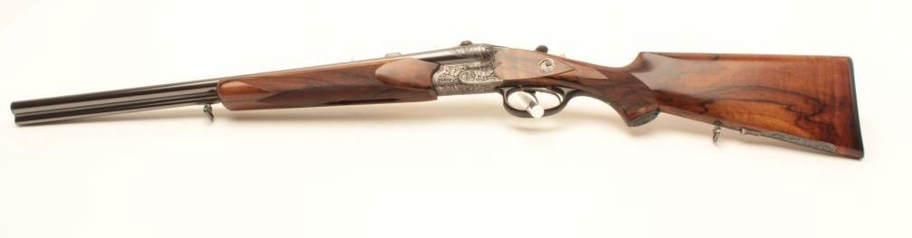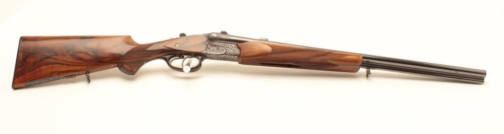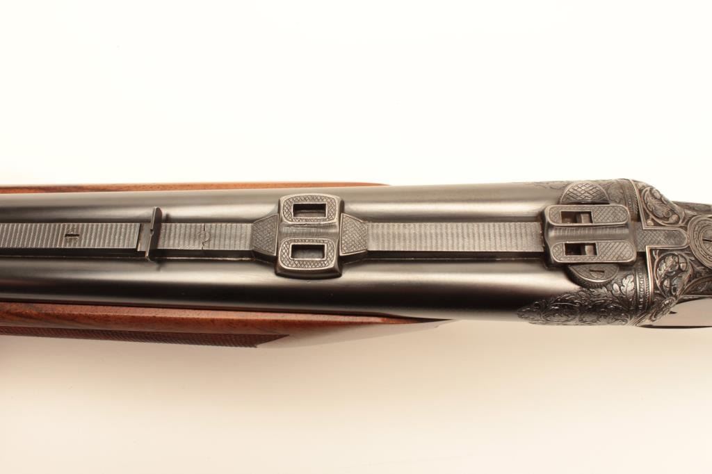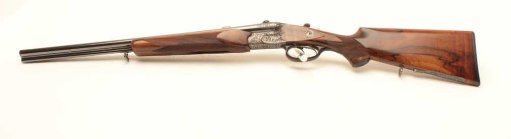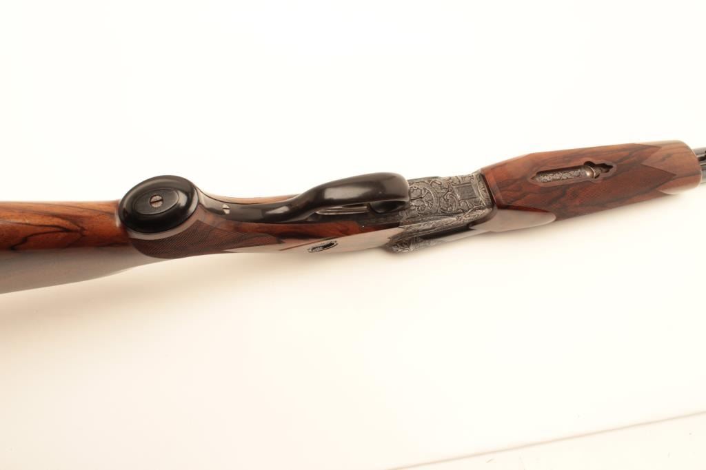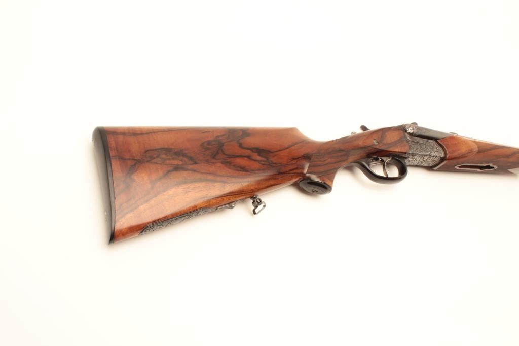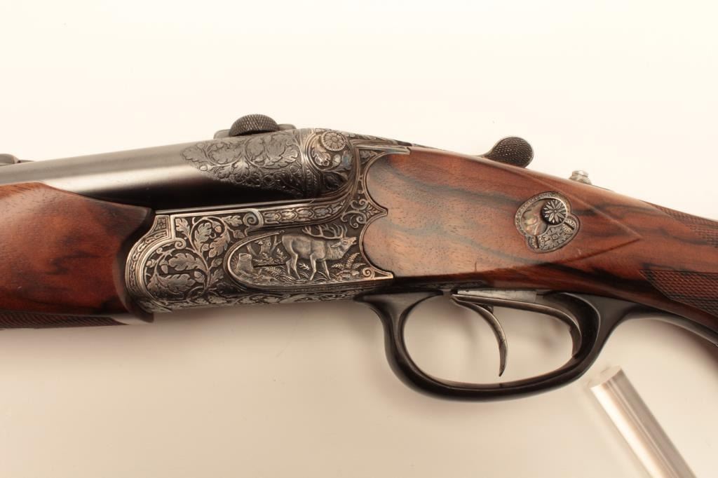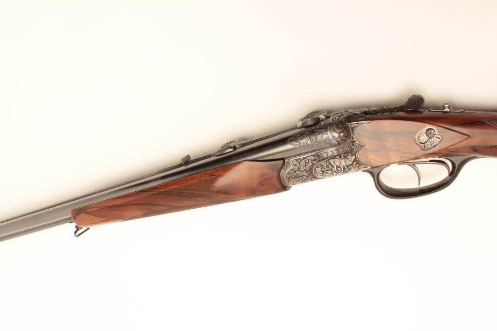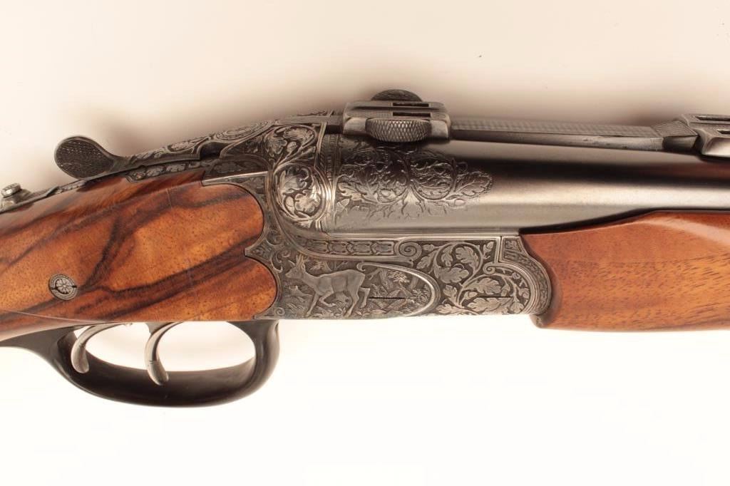 High relief engraved deluxe drilling rifle, 20 gauge SxS over 6.5x58RHO mm caliber, 23.5” barrel, blued finish to barrel assembly, double set triggers, deluxe checkered wood stocks, S/N 6345, in overall fine conditionwith fine bores, crisp actions and beautifully grained wood stocks. Accompanied by a 3 die set, ammunition and a hard carry case. (C&R/No PPT). Est.: $2,500-$5,000.