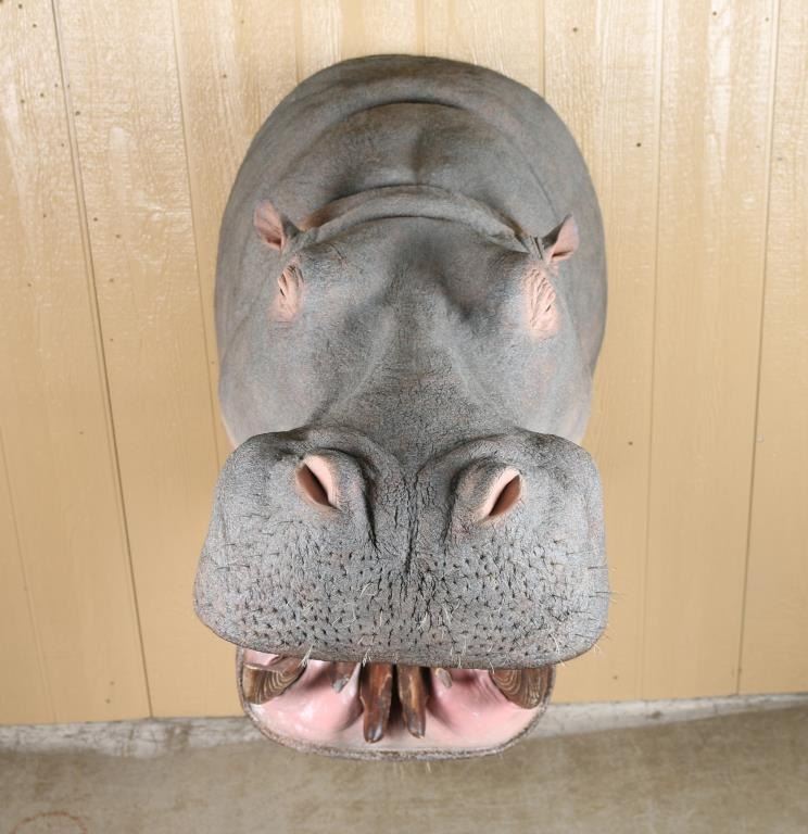 with removable teeth. No animal harmed, replica only. Consignor states "Hippo was darted in Africa many years ago. Fiberglass rendering from mold of the sleeping animal before released". Measures approx 52" x 31". Excellent condition. Heavy - large - Buyer to Arrange Pickup.
