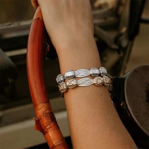 Handcrafted in our Atelier in sterling silver, our Elephant Hair Ladies Bangle brings an ancient heirloom into the 21st century. Each silver strand is individually soldered and woven into the recognizable pattern born of the traditional Elephant Hair Bangle. This timeless piece fabled to capture the strength and wisdom of the mighty elephant was embraced by notable adventurers like Amelia Mary Earhart, who always wore her Elephant Hair Bangle, and has been redesigned for the art of making life a safari.
