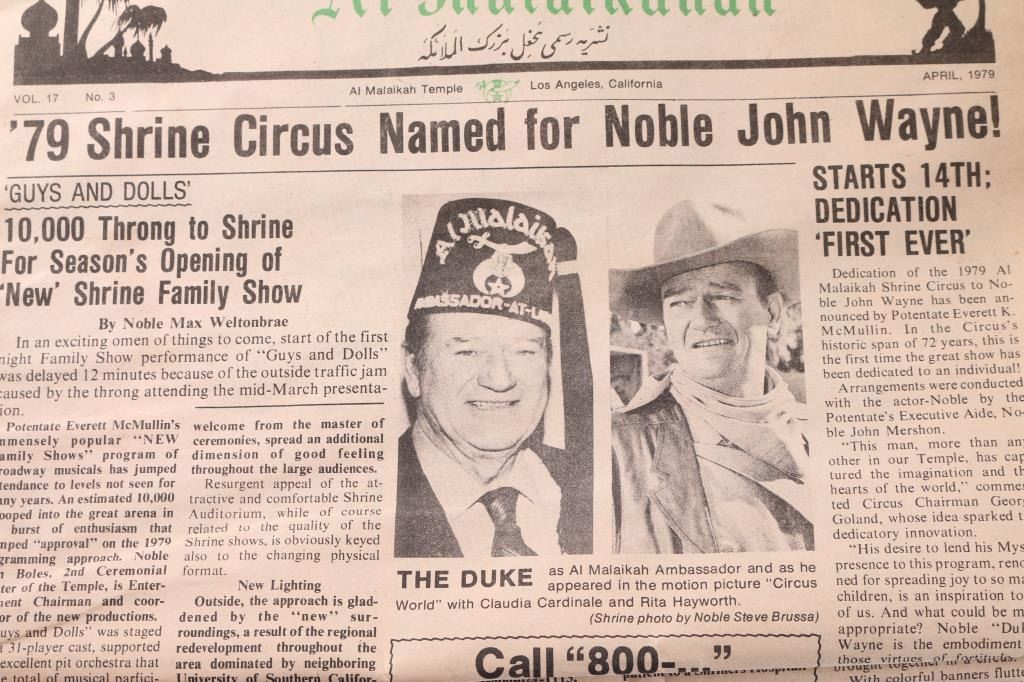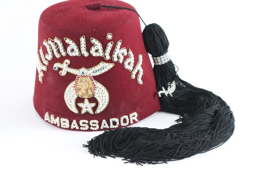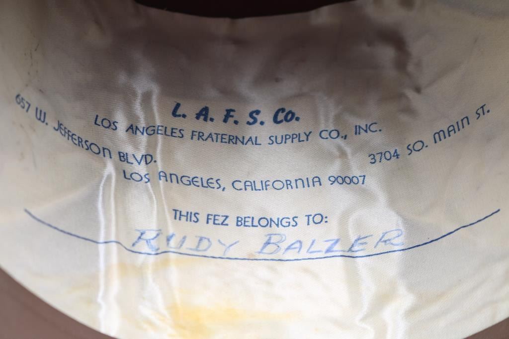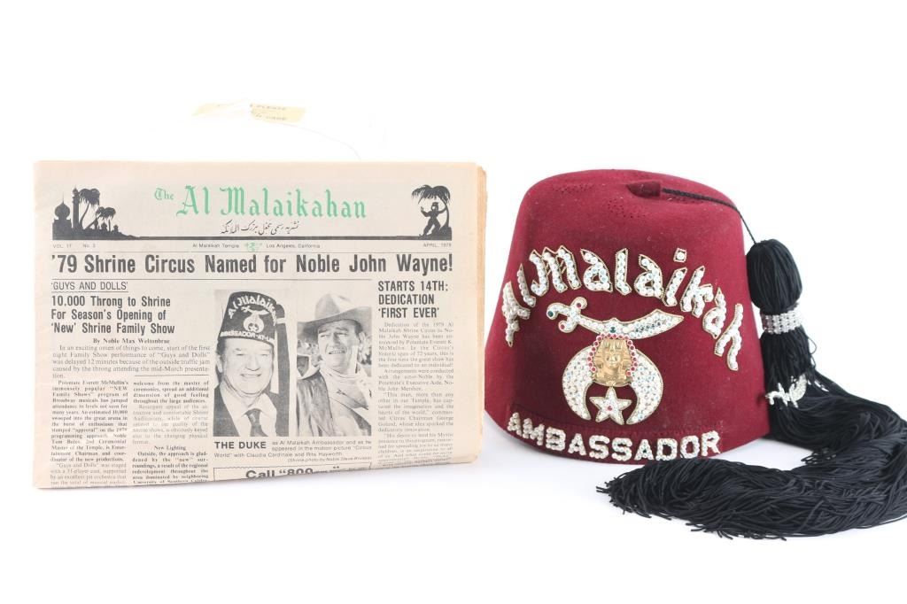 Actor and American icon, John Wayne, was a member of Al Malaikah Shriners in Los Angeles, California and wore an Ambassator-at-Large red fez hat when he appeared in the motion picture "Circus World" similar to this one from the Estate Collection of Joseph Musso. This fez is crafted of maroon felt with a black tassel and elaborate adornment spelling out "Al Malaikah / Ambassador" around the Shriner's moon-and-saber logo, with an iron patch stating "L.A.F.S.Co. Los Angeles Fraternal Supply Co., Inc. - This Fez Belongs to Rudy Balzer" on the insides of the hat band, measures approximately 6" high. Al Malaikah is the name of the Shrine Center in Los Angeles where John Wayne was awarded a fez similar to this one in 1970. Fez is in very good condition. Minimal wear. Comes with hat case.
