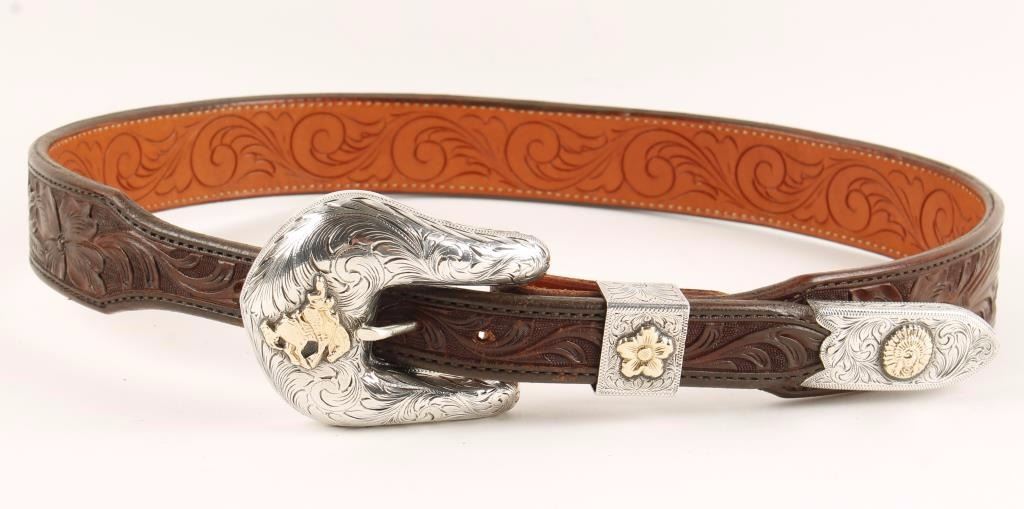 Hand tooled brown leather belt with a floral design with a large sterling silver buckle and keeper accented with a 14K yellow gold bronc rider and Indian chief design. Maker marked on belt buckle and keeper. Fits sizes 29 to 31.