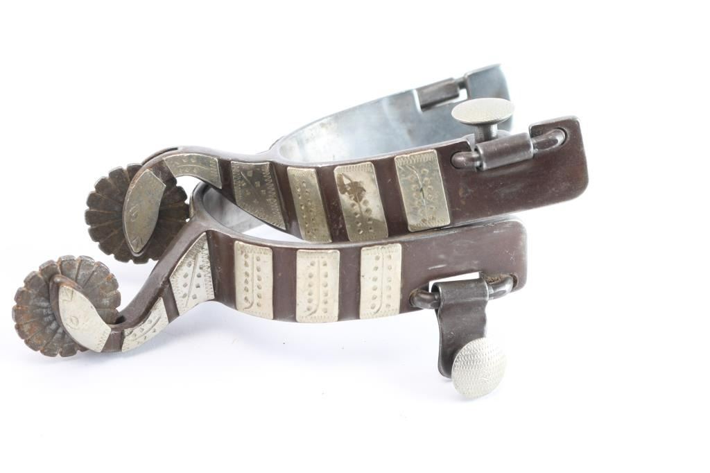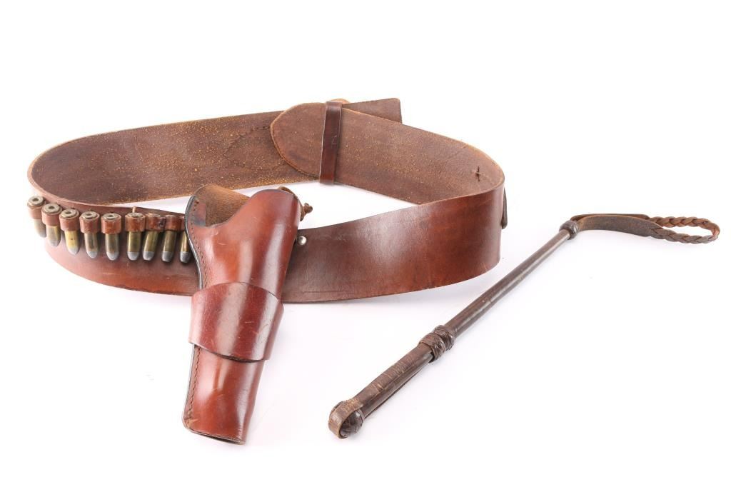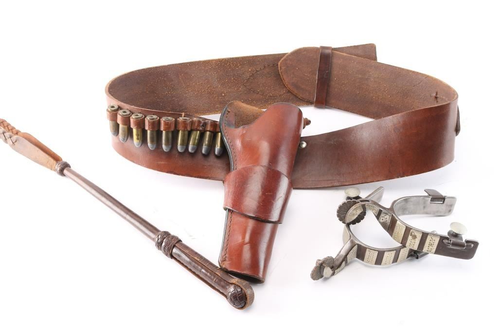 (1) Brown leather holster rig with deprimed .45LC cartridges. 38-42 inch waist. (1) pair of snake silver overlaid spurs. (1) Riding crop with a pullout dagger.