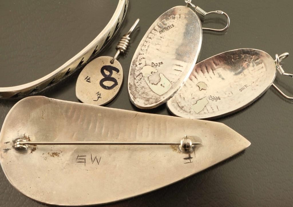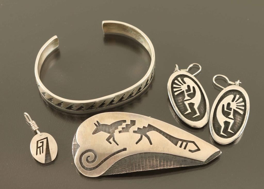 (1) Sterling bracelet (1) Fox Design sterling pin (1) Small sterling pendant (1) Pair sterling kokopeli earrings All maker marked made by Michael Sockyma .From the Spike Flanders Collection Silver City New Mexico.