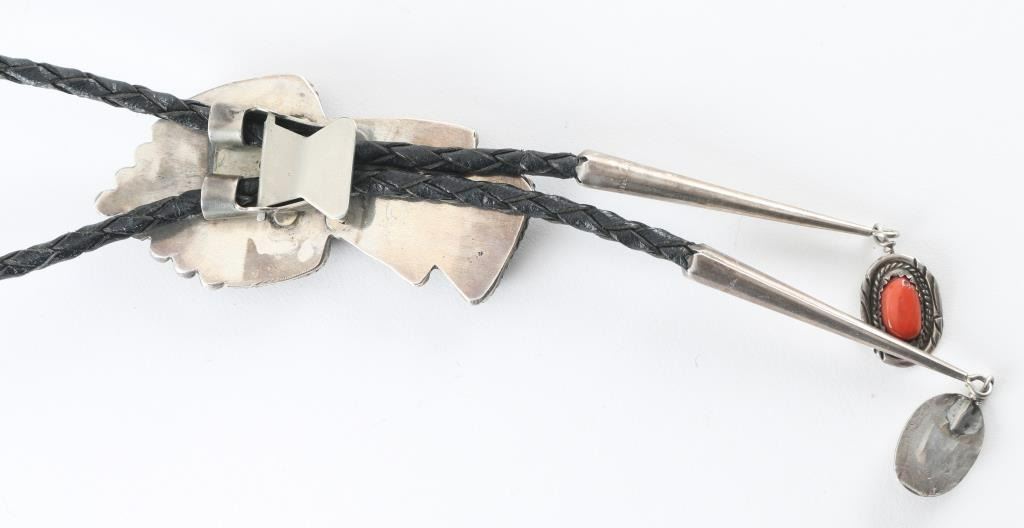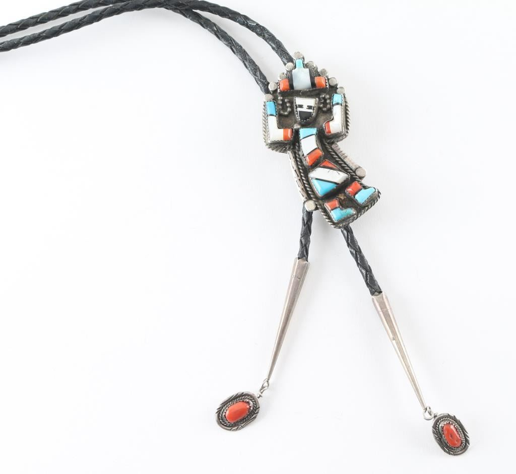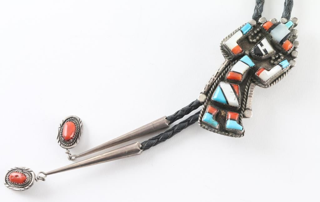 Inlaid with turquoise, coral, mother of pearl, and set in sterling sliver, unsigned, in good condition.