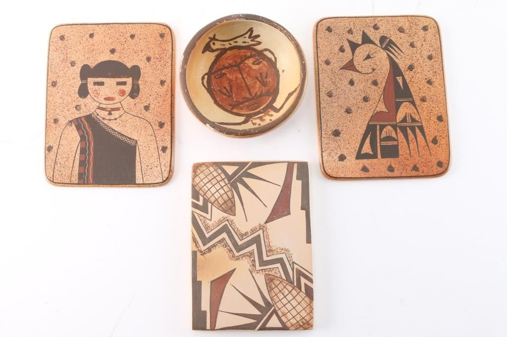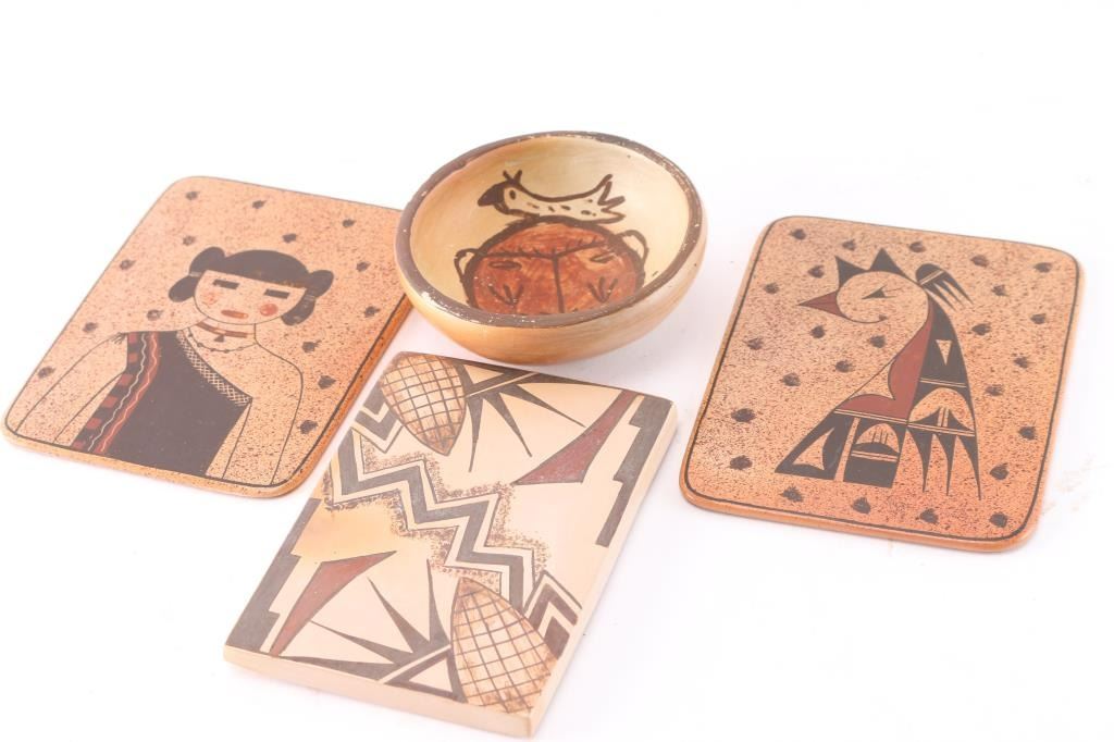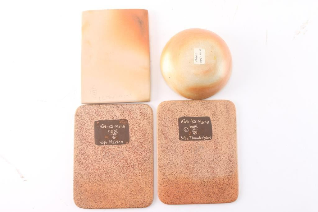 Includes: Small bowl measuring 3 1/4" width by 1 1/4" tall, with a painted Qoqole (Storyteller) kachina face inside. Also includes a maker marked glazed Hopi tile painted with corn and lighting measuring 4 1/2" by 3 1/4" by 1/4" thick; and two Hopi thin tiles titled Baby Thunderbird and Hopi Maiden respectively. Each measures 4 3/4" by 3 3/4". All pieces in great shape.