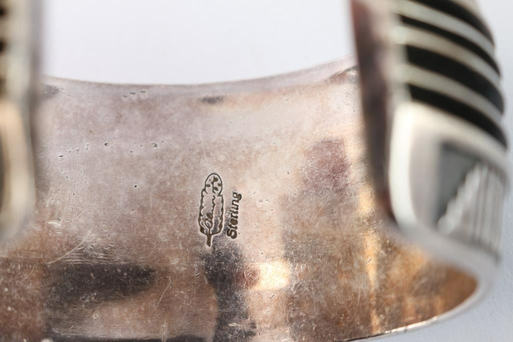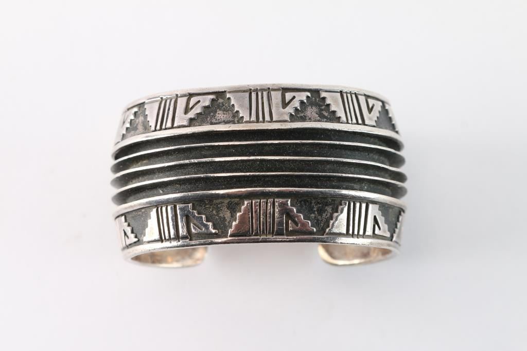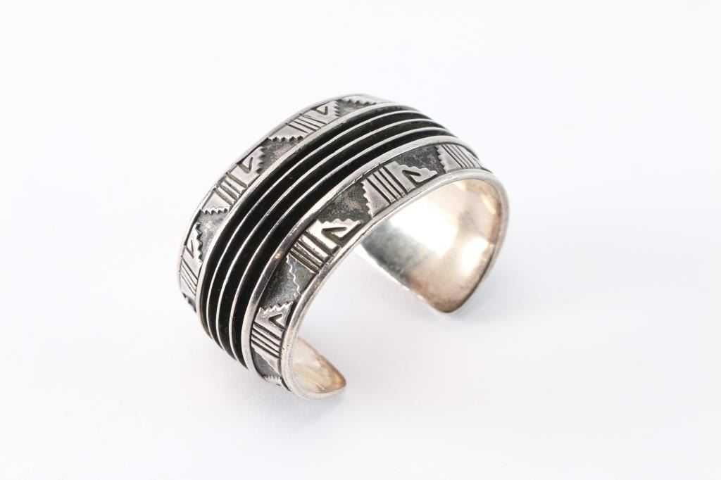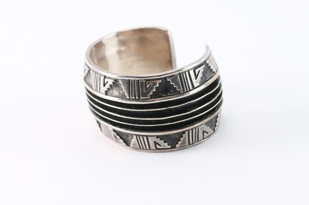 Sterling silver cuff with geometric design. Maker marked. Weighs 73.93 grams.