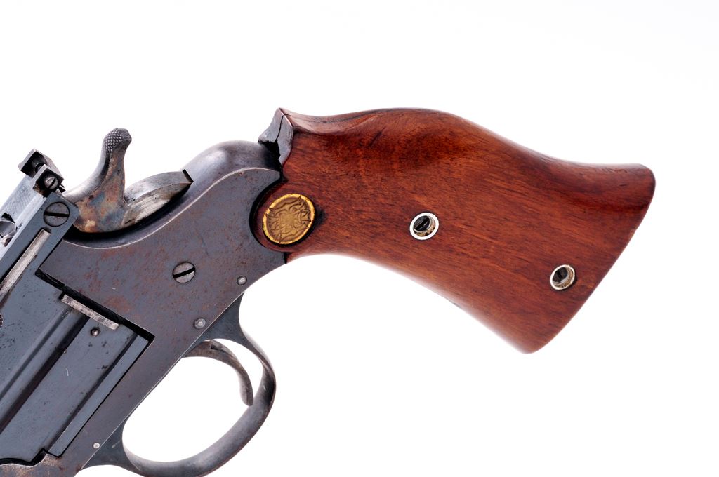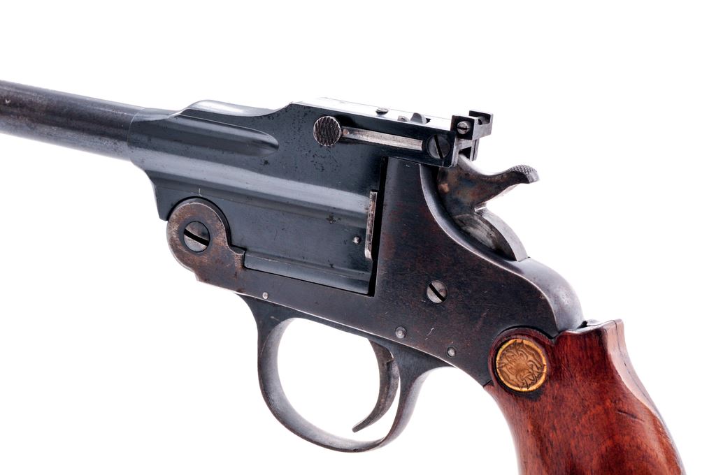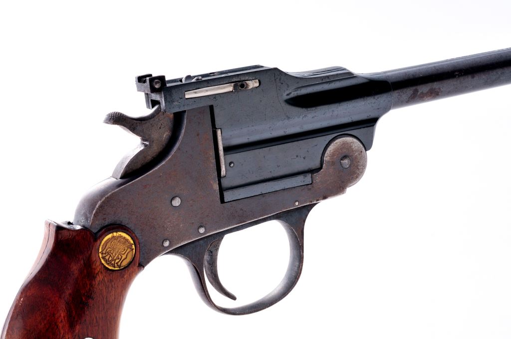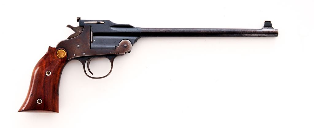 Hopkins & Allen Single Shot Target Pistol, #2151, .22 LR cal., 10'' barrel, blue finish, smooth walnut extended target grips, standard target rear and high ivory bead Lyman front sight. Ca. 1928. Condition is very good retaining approx. 80%-85% flaking and thinning blue. Top-break release missing right side button. Grips and action are excellent, bore is fine. Est.: $600-$800. (C&R/PPT)