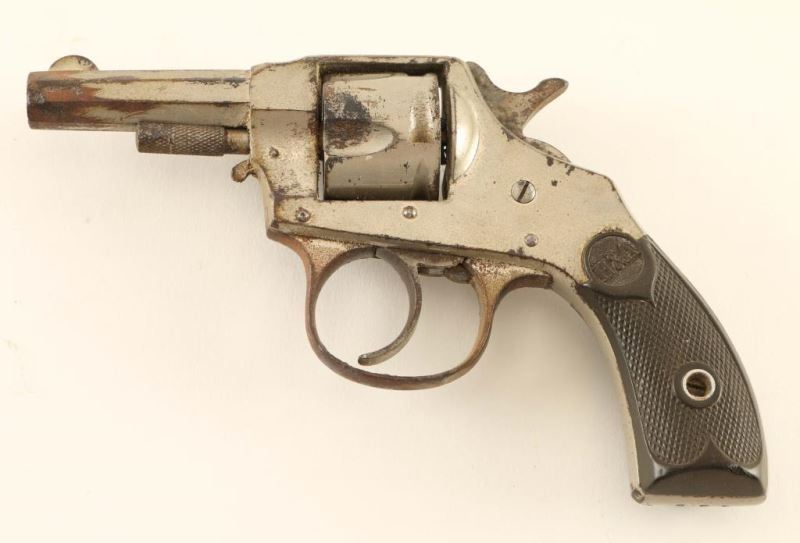 SN: 668 Antique small frame double action revolver chambered in .32 caliber centerfire, circa pre-1896. Features a nickel plated finish, 2.25" octagonal barrel, round blade front sight, channel cut rear sight, fluted five shot cylinder, smooth trigger, knurled hammer spur and two-piece checkered brown hard rubber grips with H&R decor. Revolver exhibits approximately 65% of it's nickel plated finish with dark oxidation & rust making up the balance. Action performs well, bore shows rust and the hard rubber grips are very good. Condition is NRA good. ***Antique Firearm***