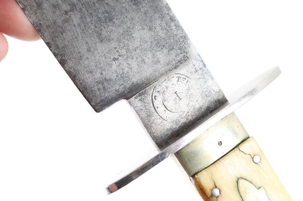 Mexican War Era Bowie, circa 1840's. The half horse half alligator pommel is the mythical creation of the British to show great respect to the Kentucky backwoodsmen, as the British called them half horse and half alligator. The American Kentucky backwoods men were led by Andrew Jackson. Features a 12 7/8" blade w/ semi-coffin shaped die-struck half horse and half alligator pommel. 17 3/4" overall. Dark patina blade w/ 1 large and small metal chips missing from edge. Some pitting and erosion. Aged horned grips with use. Red leather scabbard with metal tip and throat w/oval hanger. Overall Good condition. From the Joseph Musso Collection