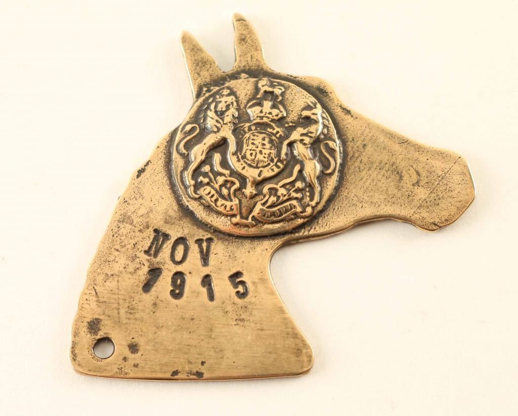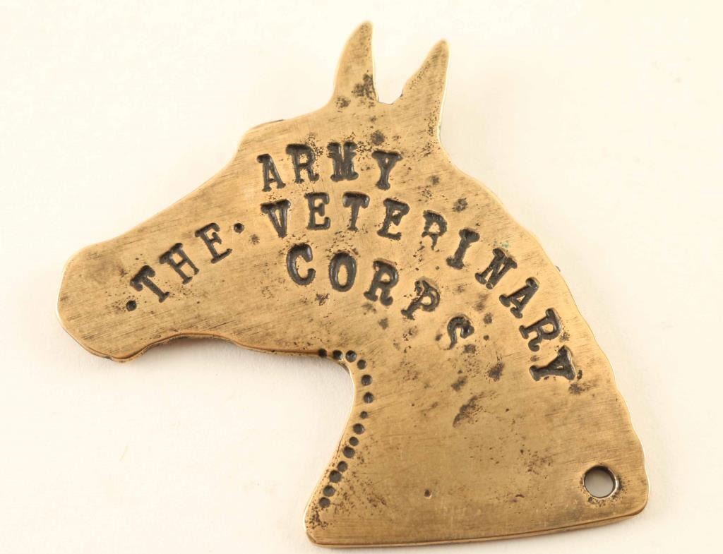 silver colored marked "ARMY THE VETERINARY CORP dated 1915" with a lions crest. unknown age. Excellent condition.