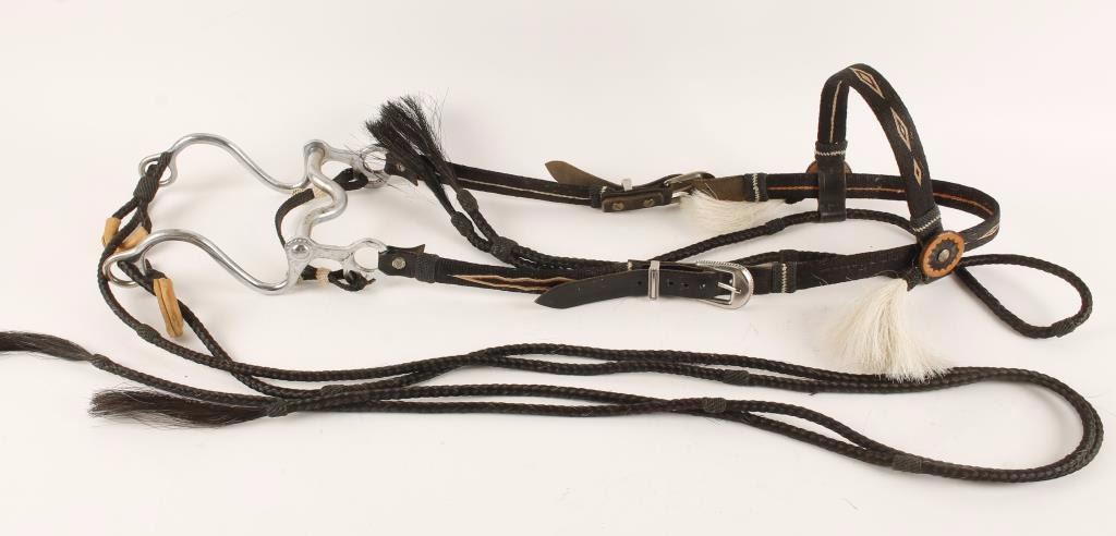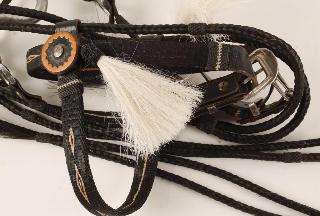 Three tone design in black, ivory and orange with leather rosettes. Hand braided reins, nickel plated Crockett marked bit.