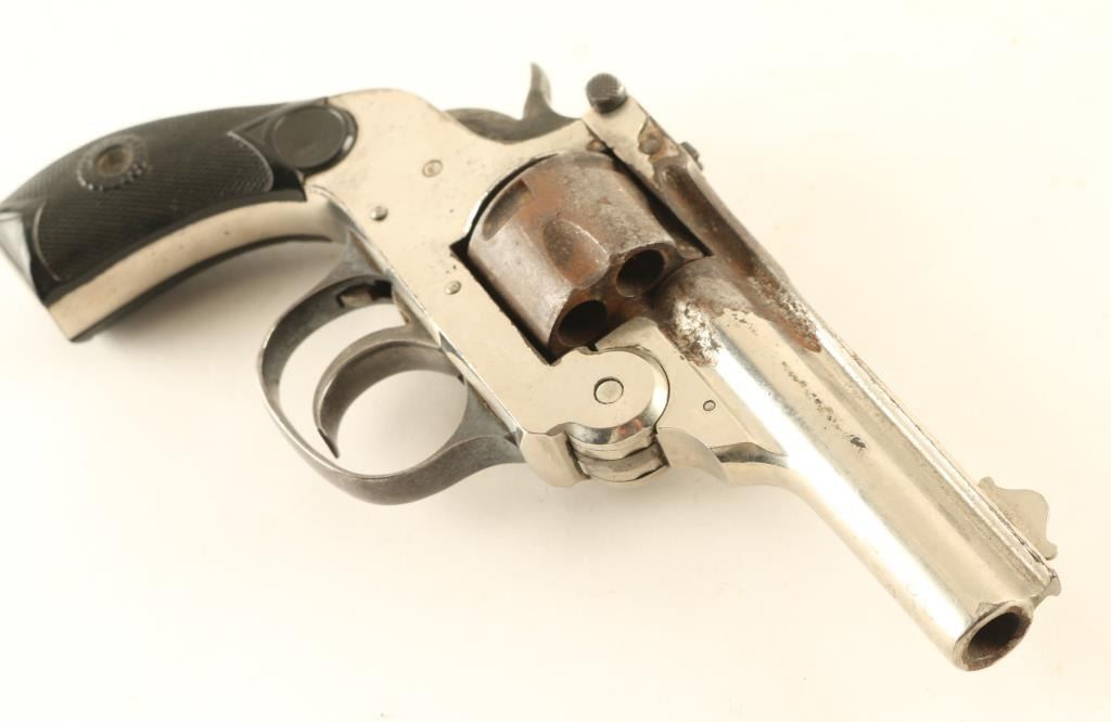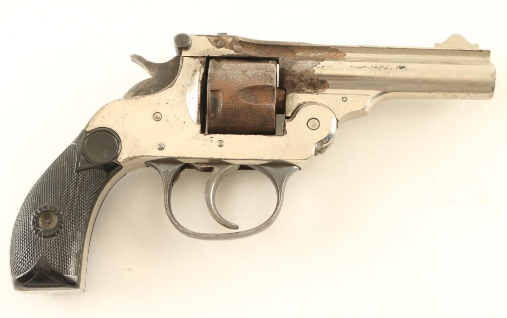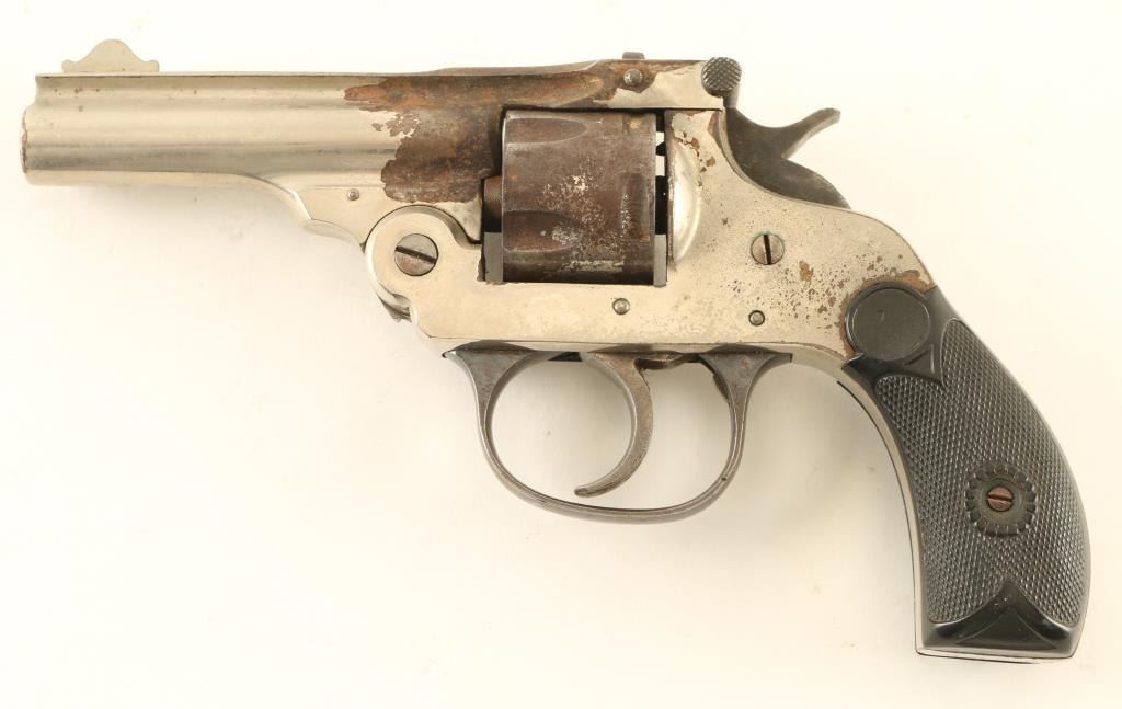 Howard Arms company was a trade name used by Sears, Roebuck and Company of Chicago, IL. Handguns were made by Meriden Fire Arms Company, a Sears subsidiary in the period 1905 to 1918. Features nickel finish, black gutta percha grips, 3" barrel, fixed sights, 5 shot cylinder, double/single action. Bore is fair condition, a bit dark, with fairly sharp edged rifling. Charge holes are brown with light surface rust. Retains 40% nickel, peeling and flaking, cylinder is mostly brown with light surface rust. Blued trigger guard, trigger & hammer are in fair to good condition, with fading blue turning a bit brown. Barrel and frame latch up tight, ejector star works sluggishly. Hammer does not stay cocked; trigger will operate in double action mode with fair lock-up of cylinder. Trigger does not return after firing. Cylinder spins freely with trigger at rest. Grips are good condition. Condition is NRA Poor *** C&R Firearm ***