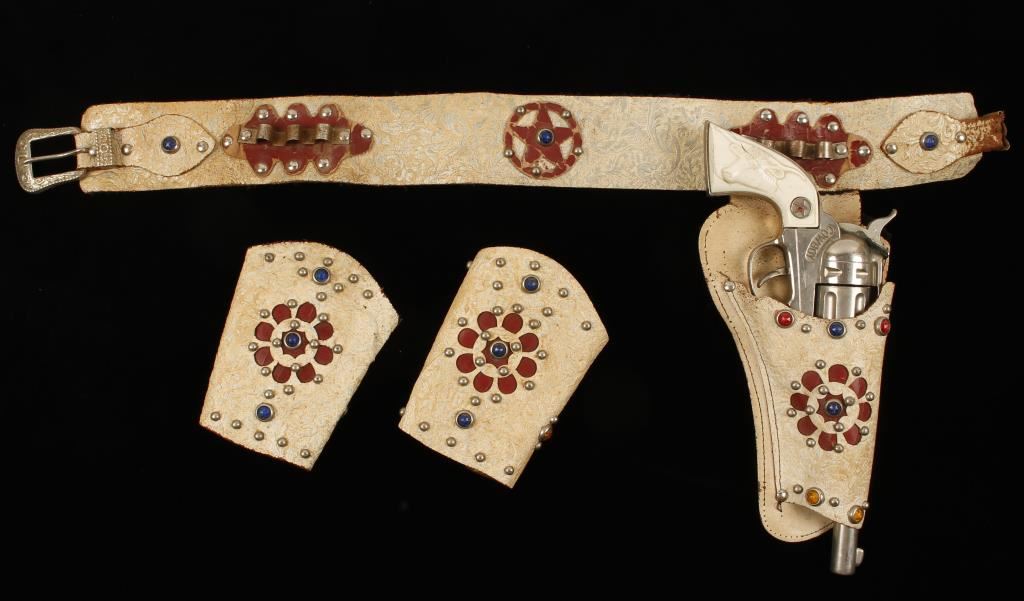& Gauntlets. Hubley was from Lancaster, Pennsylvania and started in 1894. The Hubley company made some of the finest cap guns you ever saw. The Texans and the cowboy were especially popular. This lot includes the cap gun in good working condition-gun shows some wear and one grip is cracked. The holster belt and gauntlets are all in good condition-the belt shows excessive wear near the tip.