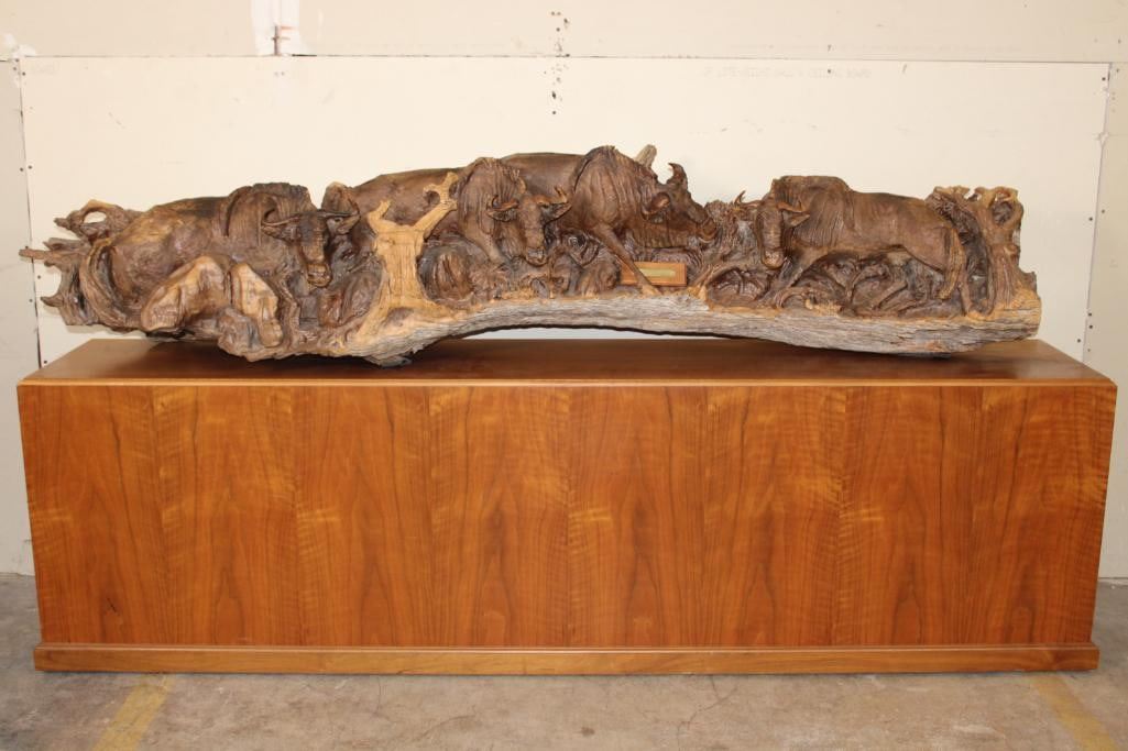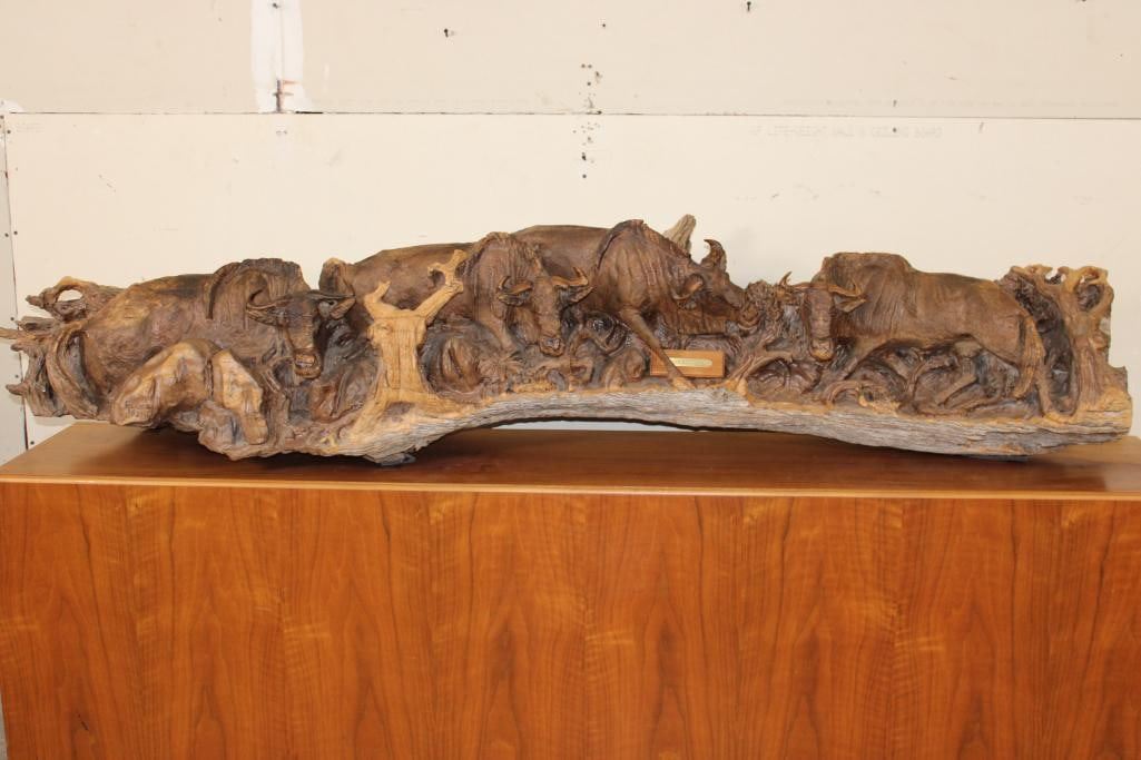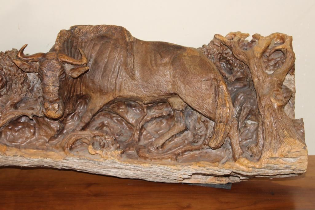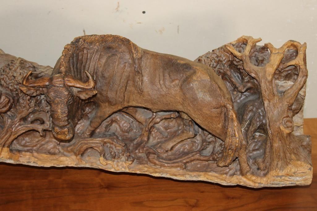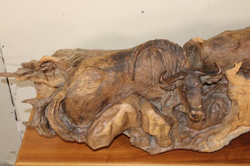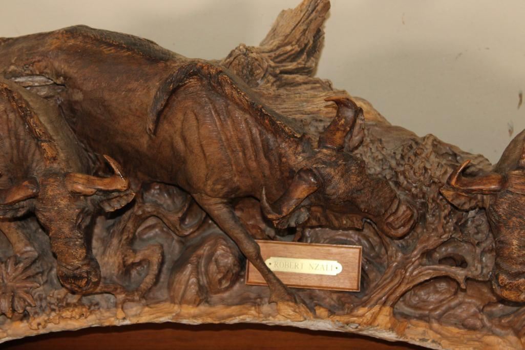 Huge Original Hand-carved Leadwood Sculpture of WILDEBEESTS by African artist Robert Nzali. It has been masterfully carved from a single piece of Leadwood. The sculpture measures 82.5" Long x 18" Wide x 17.25" Tall. It has been mounted on a rectangular Wooden Base that measures 85" Long x 17" Wide x 24.5" Tall. The Total Mount measures 41" Tall. The sculpture is removable from the Base. COLLECTIBLE AFRICAN ART AND SCULPTURES