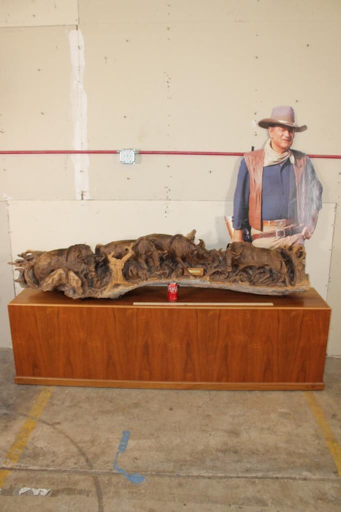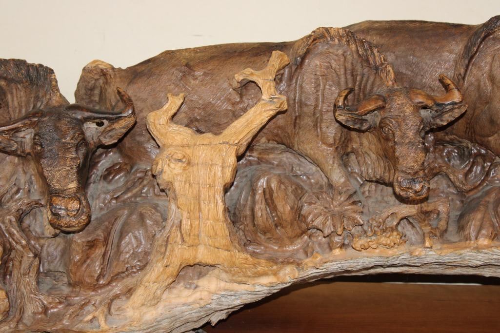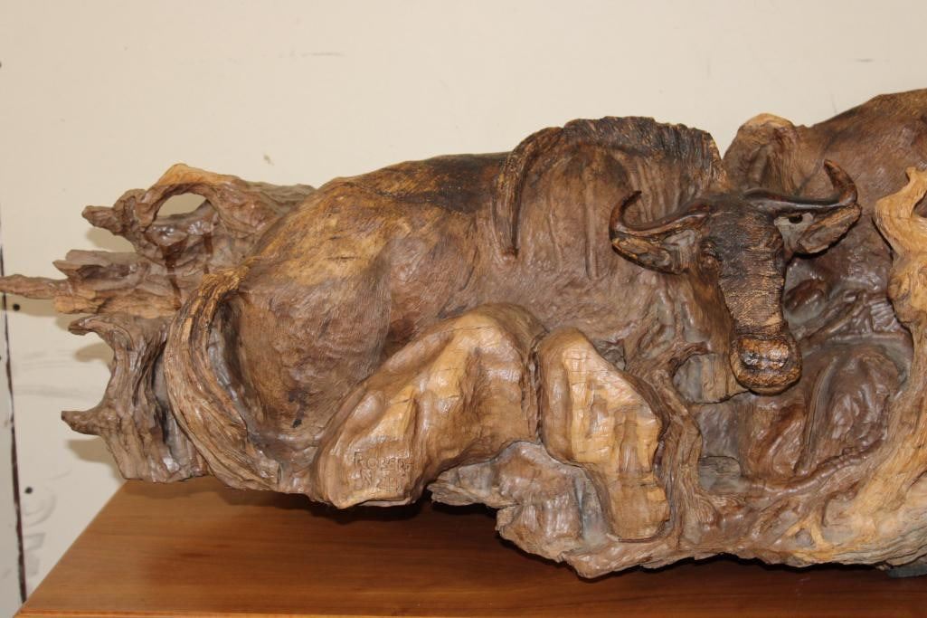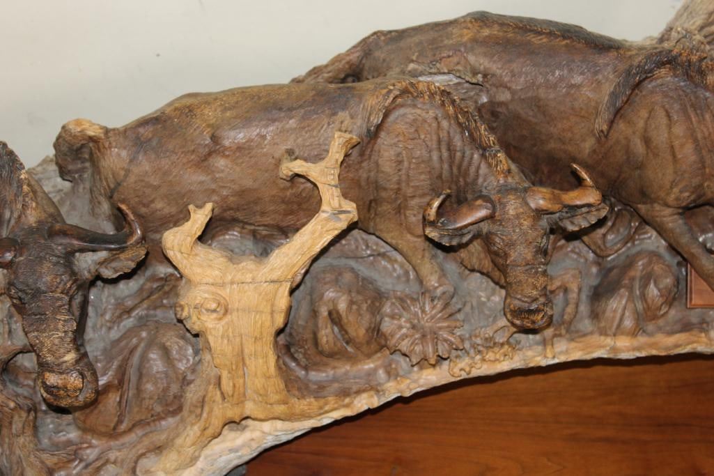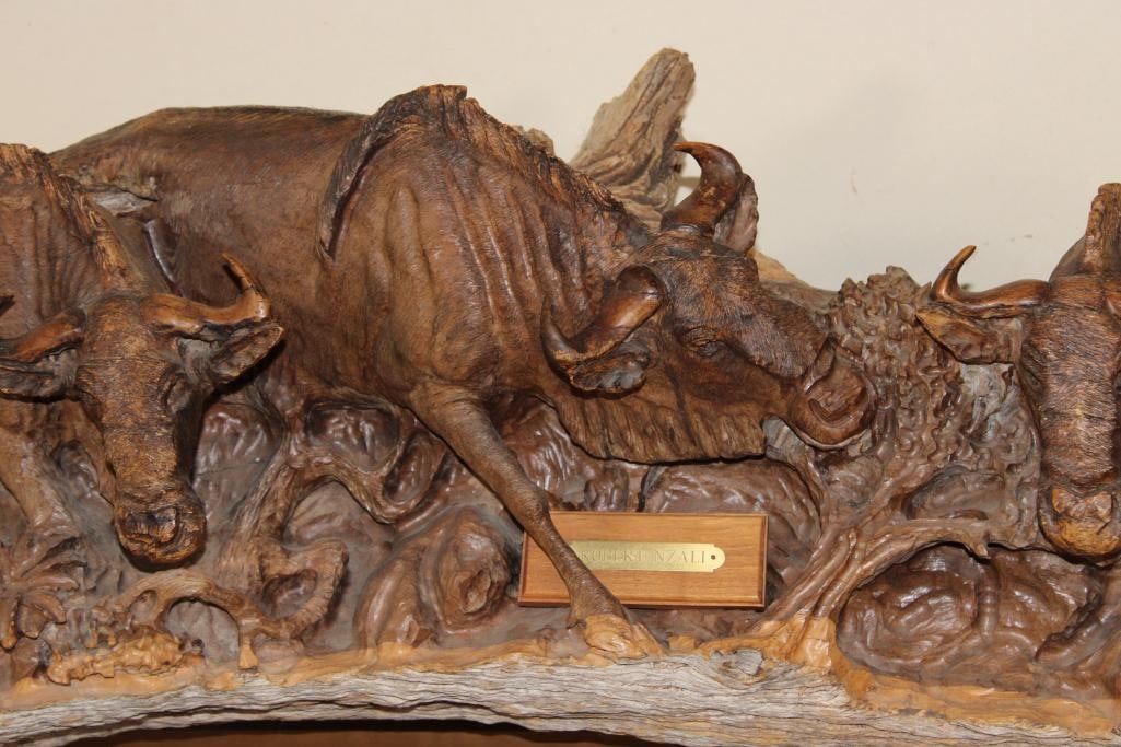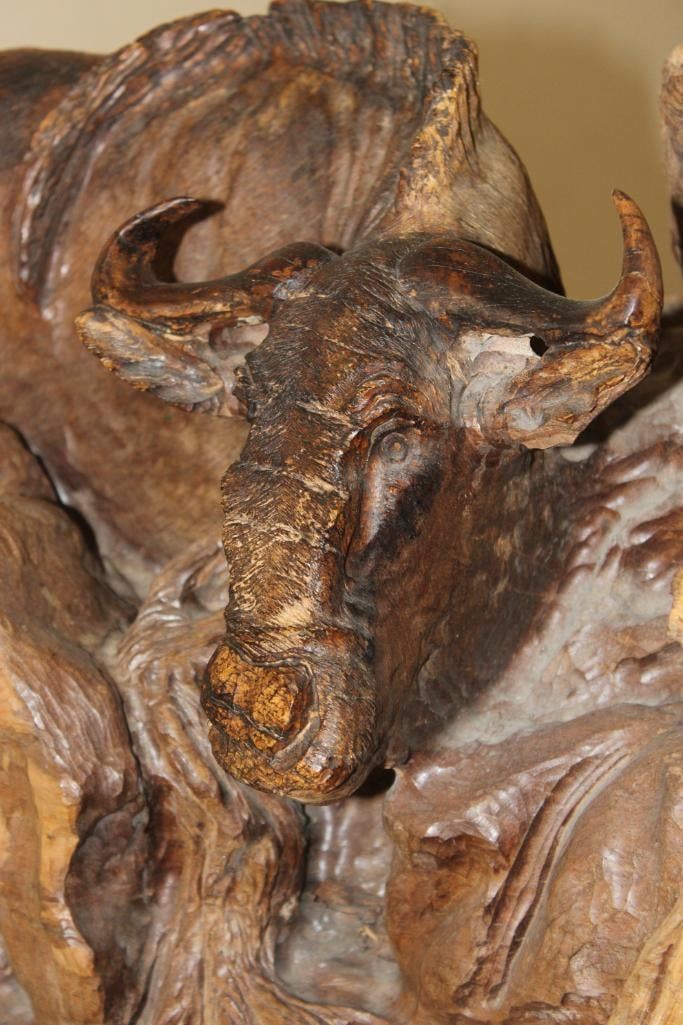 Huge Original Hand-carved Leadwood Sculpture of WILDEBEESTS by African artist Robert Nzali. It has been masterfully carved from a single piece of Leadwood. The sculpture measures 82.5" Long x 18" Wide x 17.25" Tall. It has been mounted on a rectangular Wooden Base that measures 85" Long x 17" Wide x 24.5" Tall. The Total Mount measures 41" Tall. The sculpture is removable from the Base. COLLECTIBLE AFRICAN ART AND SCULPTURES