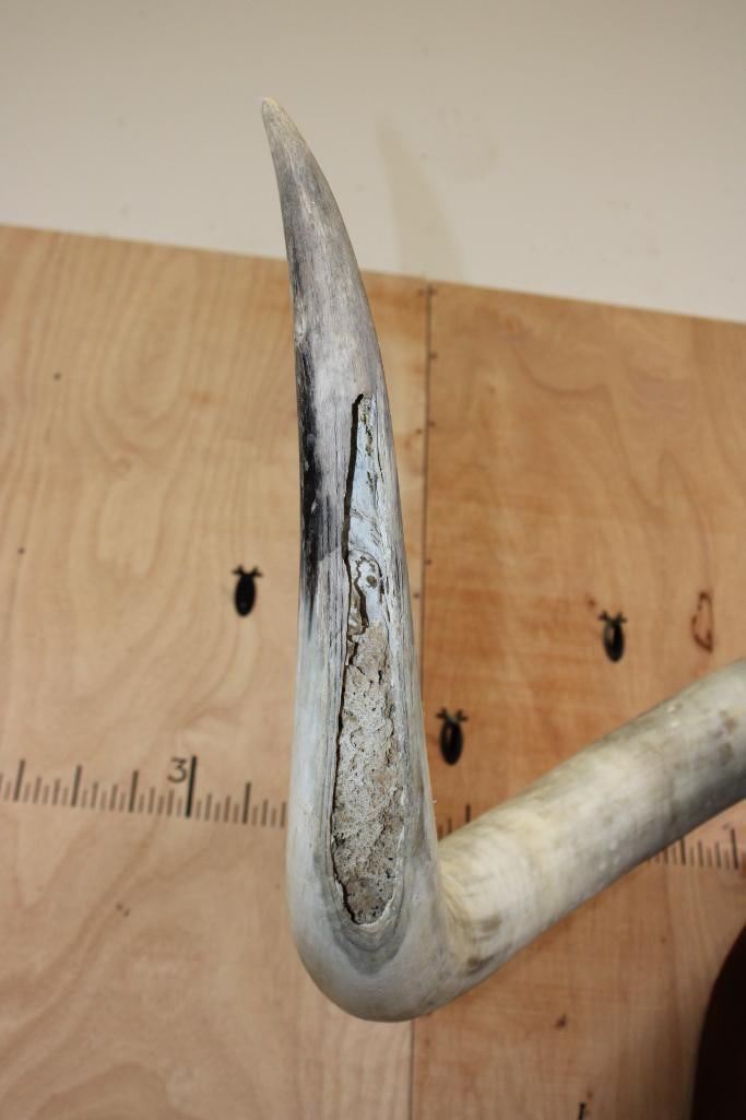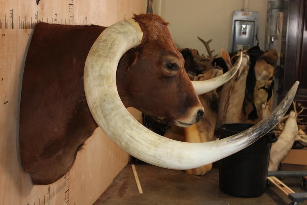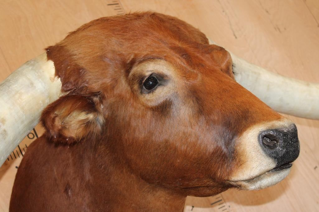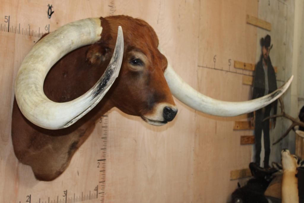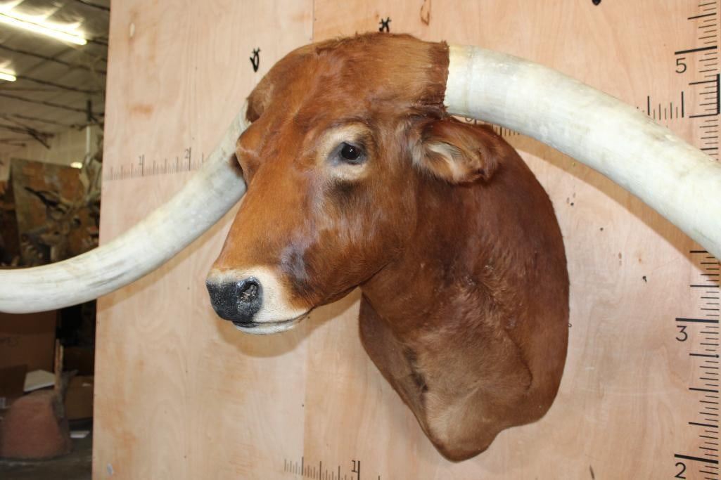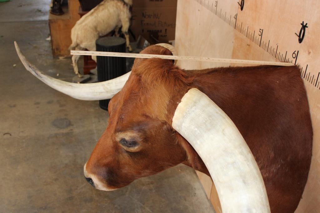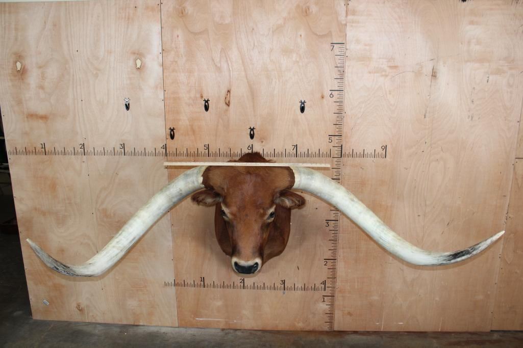 This is the Largest TEXAS LONGHORN Shoulder Mount we have ever seen! It has an 85 3/8" (Over 7' Foot) Horn Spread and a Big Texas Twist. The Left Horn measures 64.5" Long (outside the curve) and 17.5" around the Base. The Right Horn measures 67.25" Long (outside the curve) and 18 5/8" around the Base. The Right Horn has wear from daily activities such as brushing the horns as he ate etc. TAXIDERMY