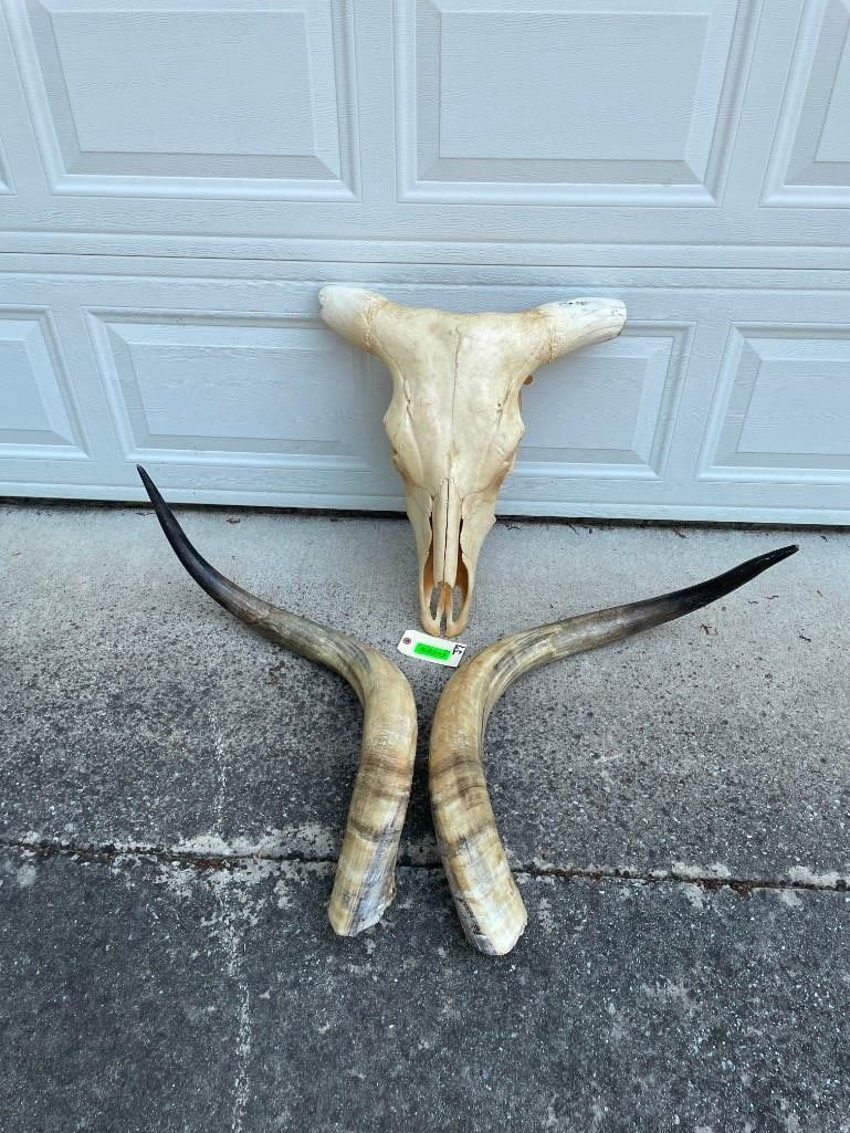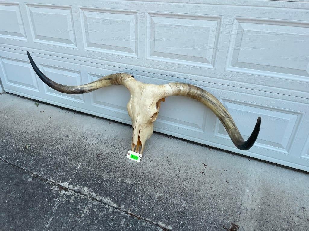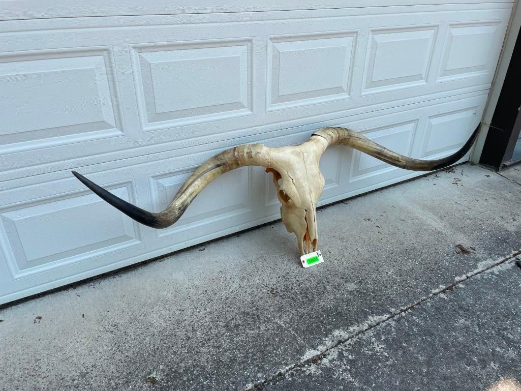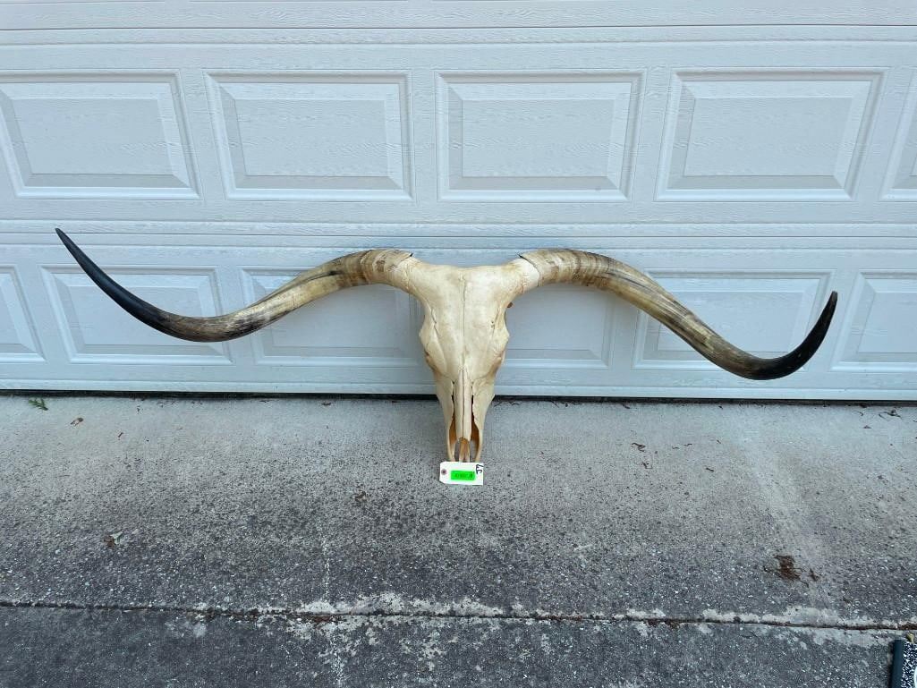 This Huge Texas LONGHORN STEER Skull has a 69" Horn Spread from Tip to Tip. The Big Texas Twist Horns measure 47" and 48" Long and are removable. These would make a bold statement in any western space such as a ranch, log cabin, or hunting lodge. TAXIDERMY
