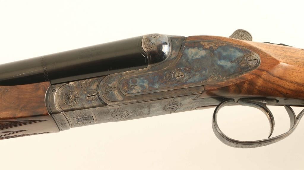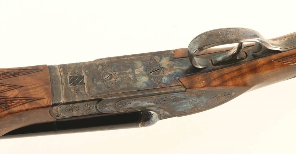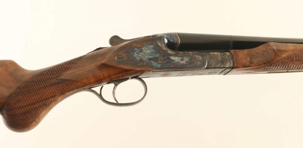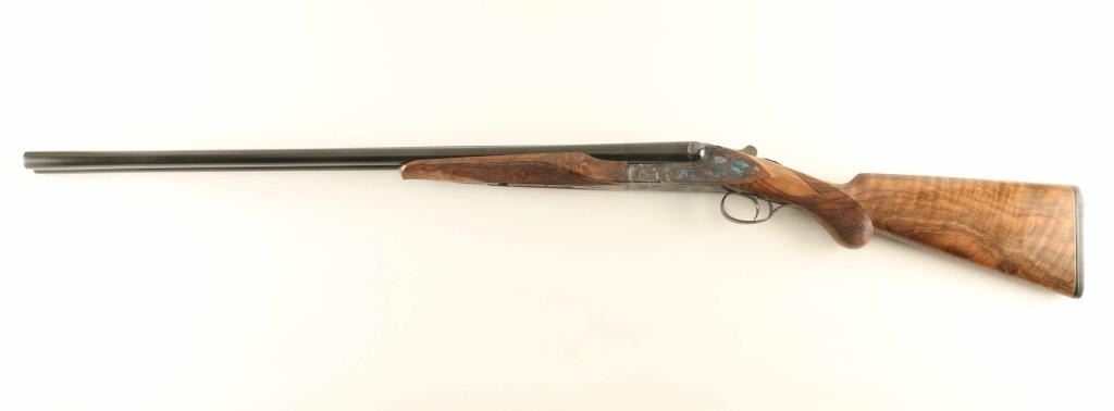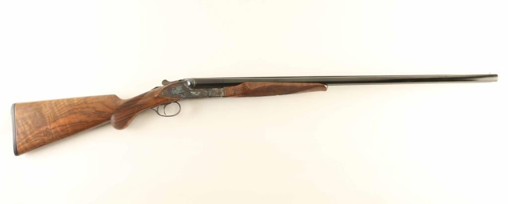 Turkish Side by Side shotgun imported by CZ USA, Kansas City KS. Features blued barrels, case color action, wide beavertail wood forend with checkered panel, wood butt with checkered Prince of Wales shaped grip, all wood is deluxe fancy figure walnut, solid rubber butt pad, 28" barrels with solid rib, brass front bead, accepts choke tubes (MOD left, IC right are installed), single plate extractor, single trigger, internal hammers, sideplates, tang safety with barrel selector switch. Accepts up to 3" shells. Bores are excellent. Retains 95% finish with some scuffs & scrapes. Action is excellent condition with bright fiery case color, the bottom of the right barrel show some slight edge wear, engraved with border pattern and limited floral scroll motif, two headed eagle on top lever boss. Wood is near excellent condition with several dents, creases, and scratches. Approx stock measurements: 14-1/2" Length of Pull, 1-3/8" Drop at Comb, 2-3/8" Drop at Heel.