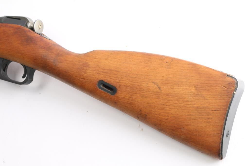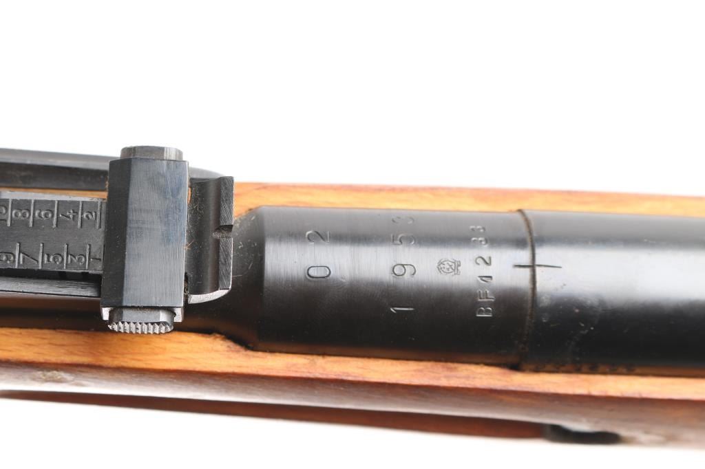 Cold war era Hungarian military carbine, dated 1953. Features a 20" barrel with front post, and tangent rear sights, side folding 12" cruciform bayonet, integral magazine, with hinged floorplate. Blue is about 98% with minor scratches. Wood is very good, bore is excellent/bright. Action is sound though the bolt hangs up on removal and insertion. CAI import marked on left barrel. Cleaning rod present. Matching serial numbers on barrel, receiver, floorplate, bolt and steel buttstock.NRA Condition-Very Good+. C&R Firearm.