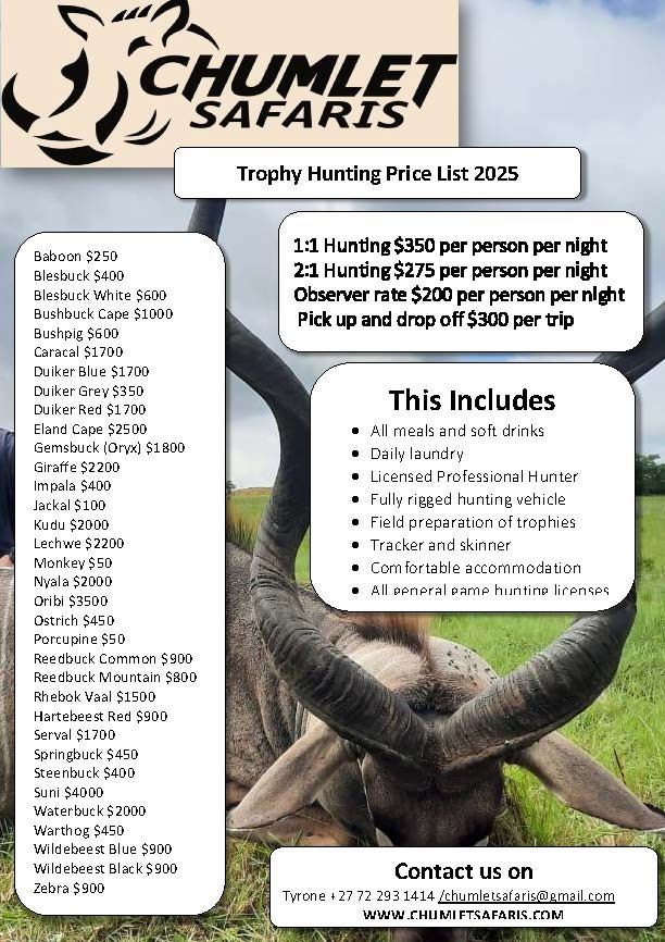 Includes trophy fees, tag/license fees. We hunt the BIG 5! The hunt is for two but additional hunters can attend for $280 per night with non-hunting guests welcome at $180 per night. This is a rifle hunt and a firearm permit is required if you bring your own weapon. For other available animals, please review our price list. Check with the outfitter for dates.