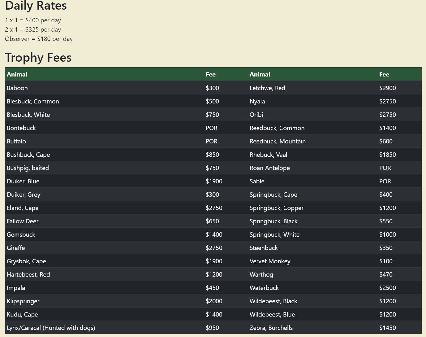 This Package Does Not Include ——— Any air travel, pre and post Safari accommodations and meals, trophy fees for animals taken in addition to the donated animals or animals wounded or lost, hire of rifles and ammunition, gratuities to PH and camp staff, preparation, packing, documentation, taxidermy, export of trophies from South Africa, and all items of a personal nature.