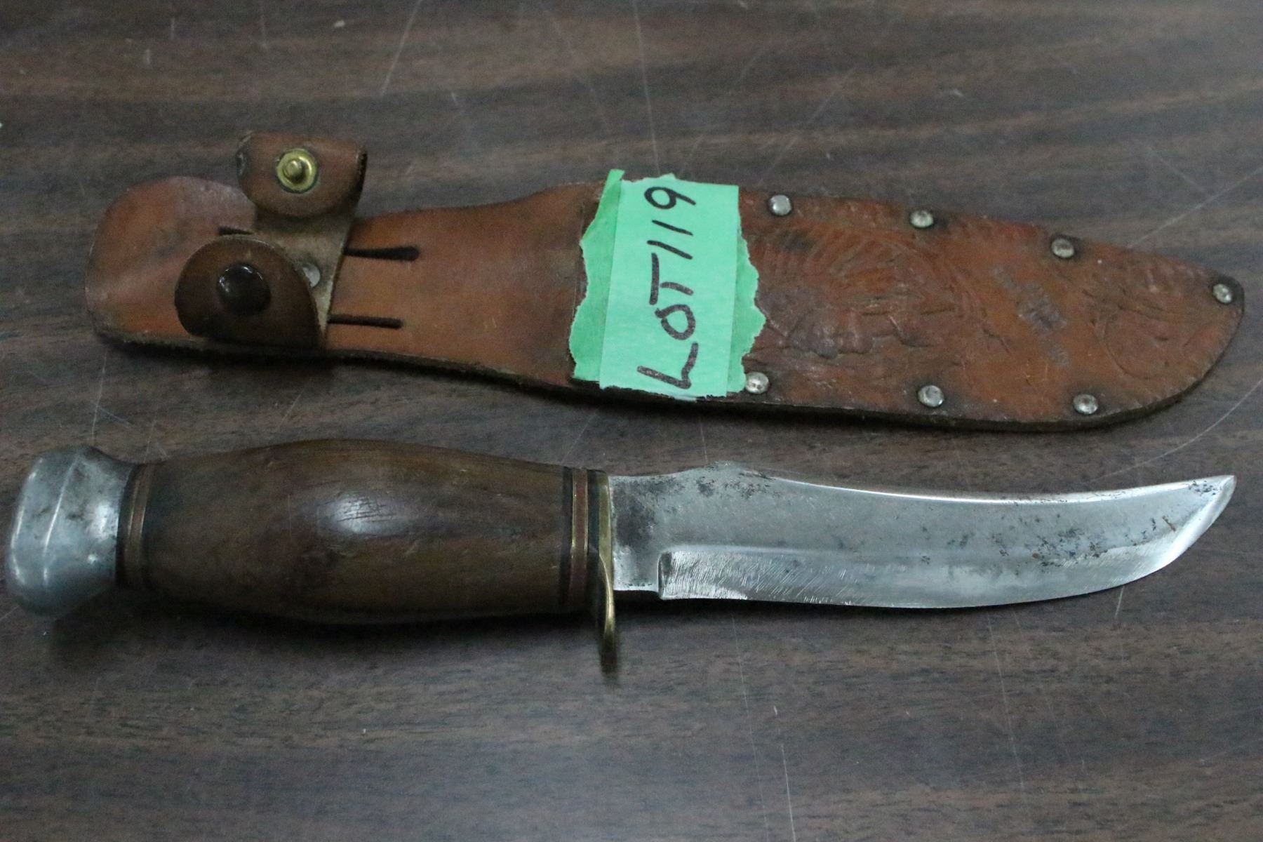 Hunting Knife w/5" Blade, Wood Handle & Sheath - Stamped 'Kirkland Lake Ontario'
