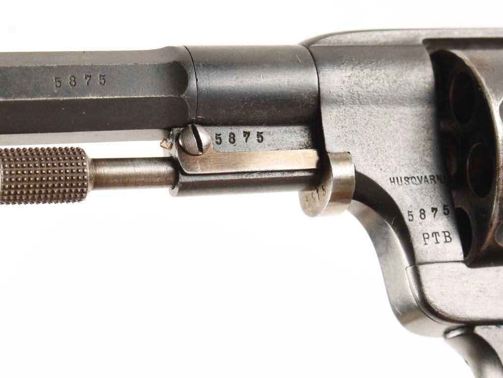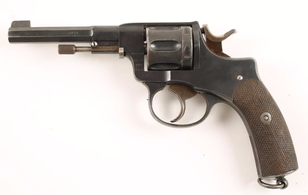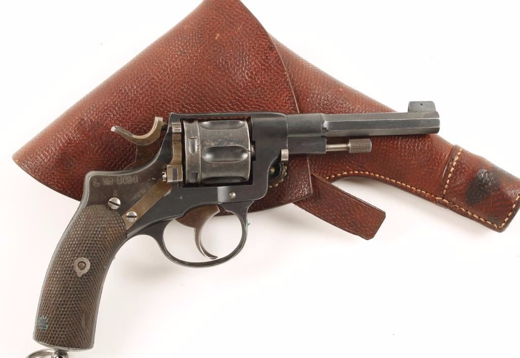 Swedish military double action six-shot revolver chambered in 7.5mm Nagant, circa 1900's. Features a blued finish, 4.5" half octagonal barrel, blade front sight, v-notched rear sight, swing out ejector rod, fluted cylinder, straw colored hammer, trigger & loading gate, all matching serial numbers, steel frame marked "L No 2658 A", checkered grip frame, lanyard loop and two piece checkered walnut grips. Includes original military brown leather flap holster. Finish shows light edge wear, light pitting starting on left side of frame rear barrel and heavier wear on cylinder. Straw colors are very good and mostly intact. Action is strong, bore is very good and wood stocks are good with a dent & checking worn slightly smooth. Condition is very good+. ***C&R Firearm*** ***Modern Firearm***
