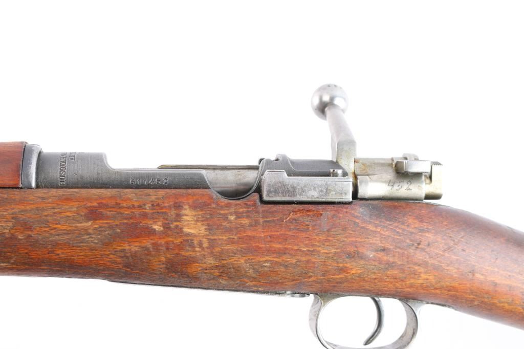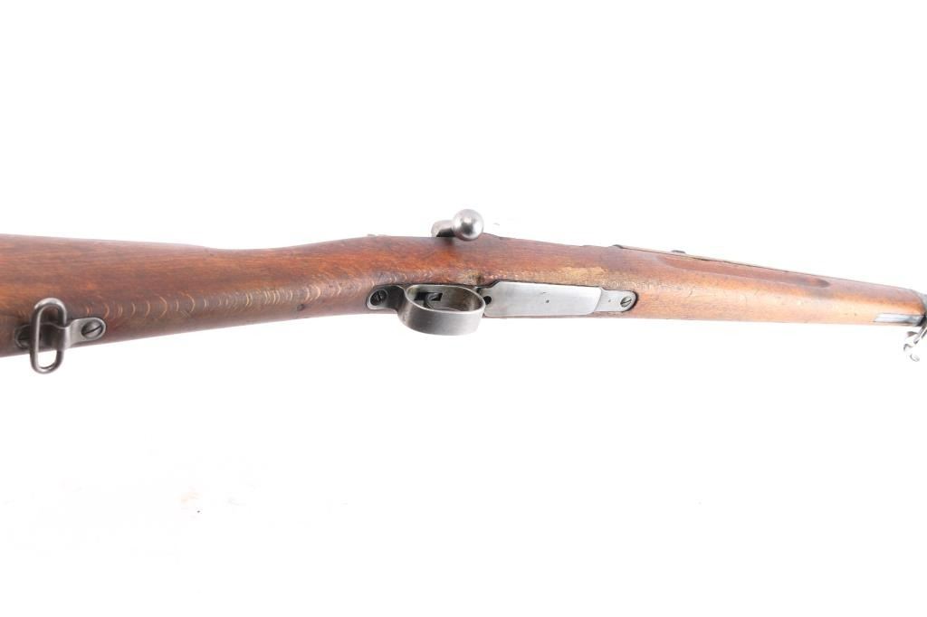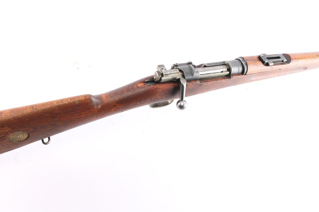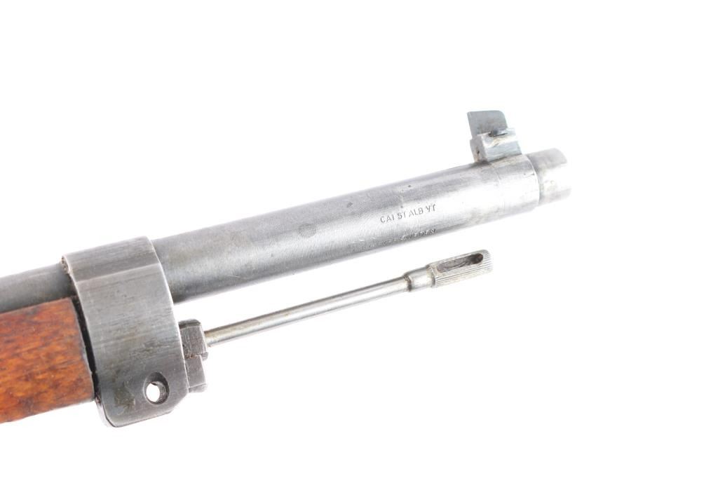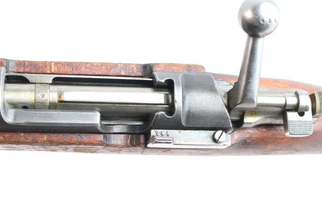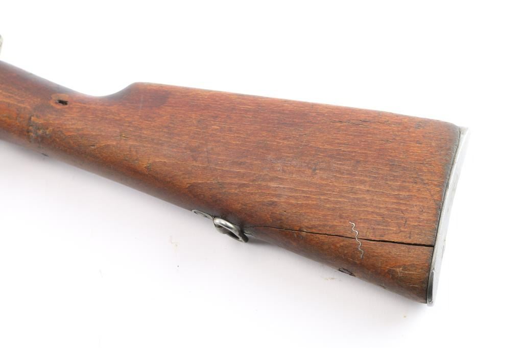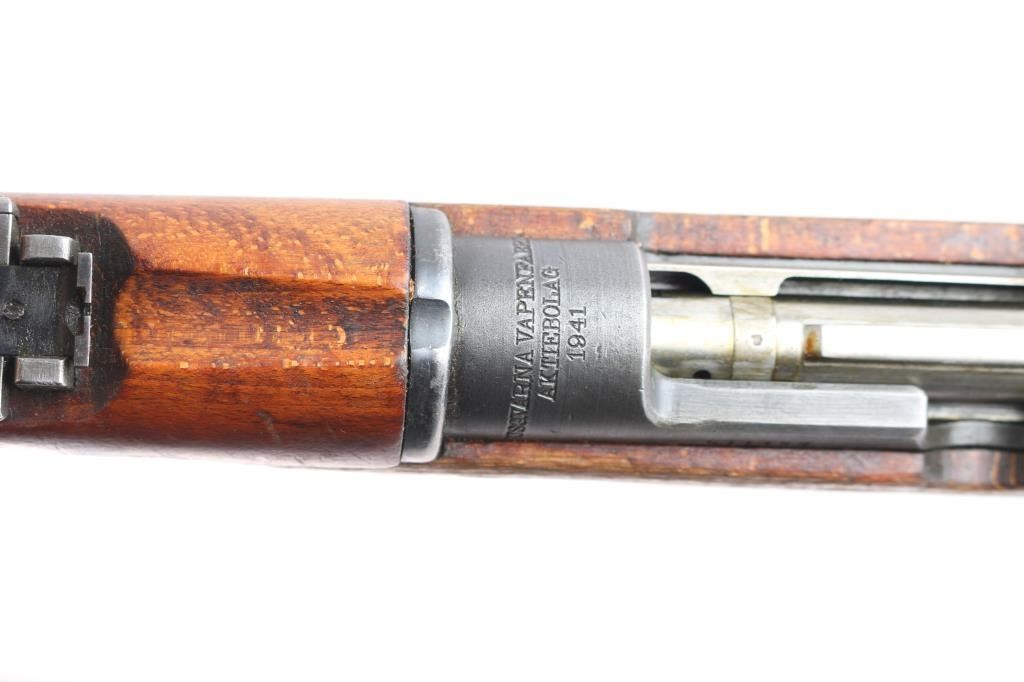 Husqvarna WWII era Swedish military short bolt action Mauser rifle chambered in 6.5x55mm Swedish, manufactured circa 1941. Designed for mounted troops. Receiver ring stamped "Husqvarna Vapenfabriks Aktiebolag, 1942" Imported by CAI, St. Albans, VT. with import marks on the right side of the barrel. Features a blued finish, 23.5" barrel, partridge front sight, tangent rear sight graduated to 600 meters, bayonet lug, cleaning rod, smooth curved trigger, internal 5 round box magazine, integral stripper clip guide cut in the receiver, in-the-white finished bolt with turned-down handle & three-position safety on the rear, sling swivels, smooth wood handguard with a small crack and straight grip shoulder stock with a repaired broken piece at the bottom, grasping grooves in the forend, brass stock disc & smooth metal buttplate. Matching serial numbers "452" are found on the buttplate, and bolt. The brass stock disk is marked 6.51" bore diameter, #3 bore co. Rifle retains more than 30% of the blue finish with scratches, handling/edge wear. Action is smooth/tight. Bore is bright but worn. Wood is fair with small scratches/dings.