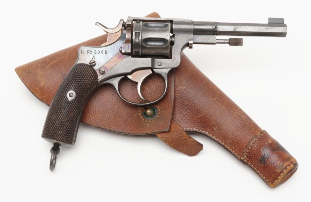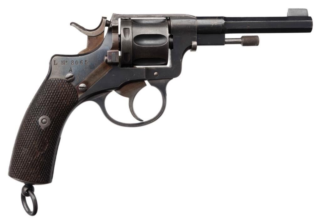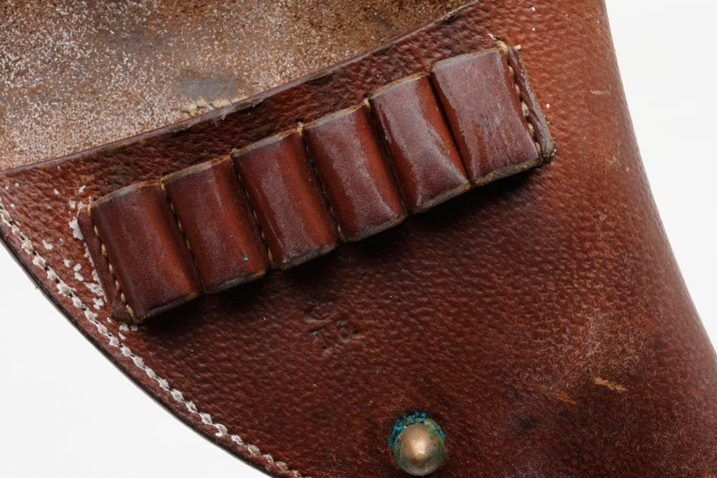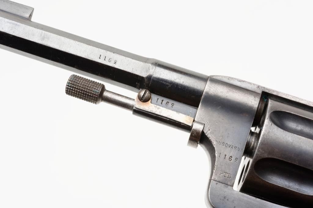 *Husqvarna DA revolver, 7.65mm caliber, 4.5” barrel, S/N 1162 (back of right side of frame stamped “L No 8065 A”, possibly a military or police ID #); blued finish, checkered wood grips with lanyard ring and leather holster; overall very good + condition. Est.: $250-$450.
