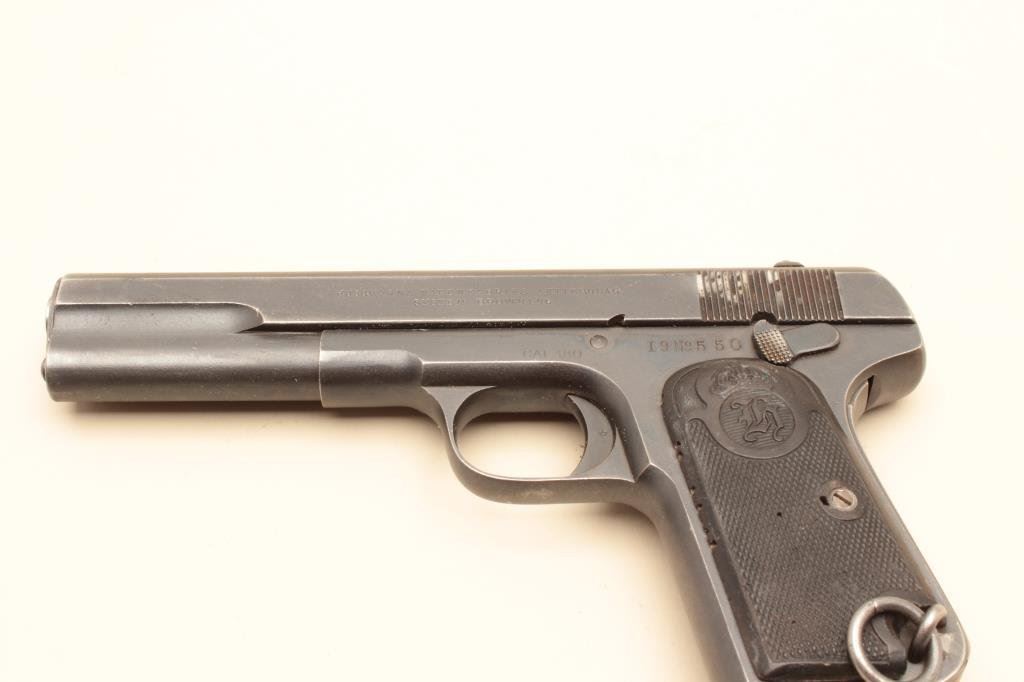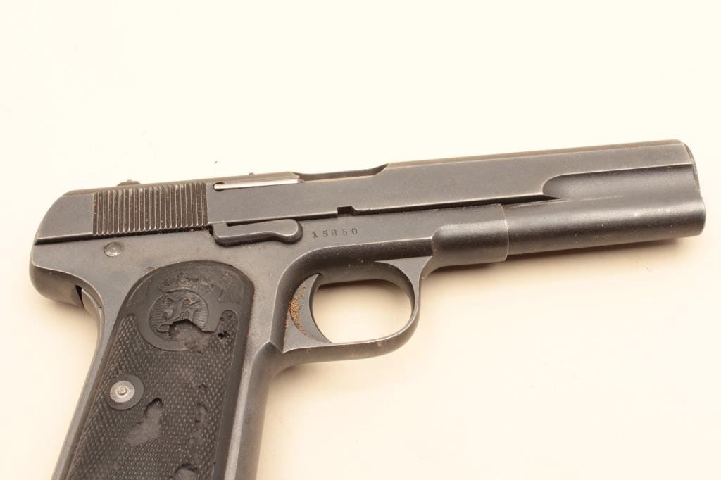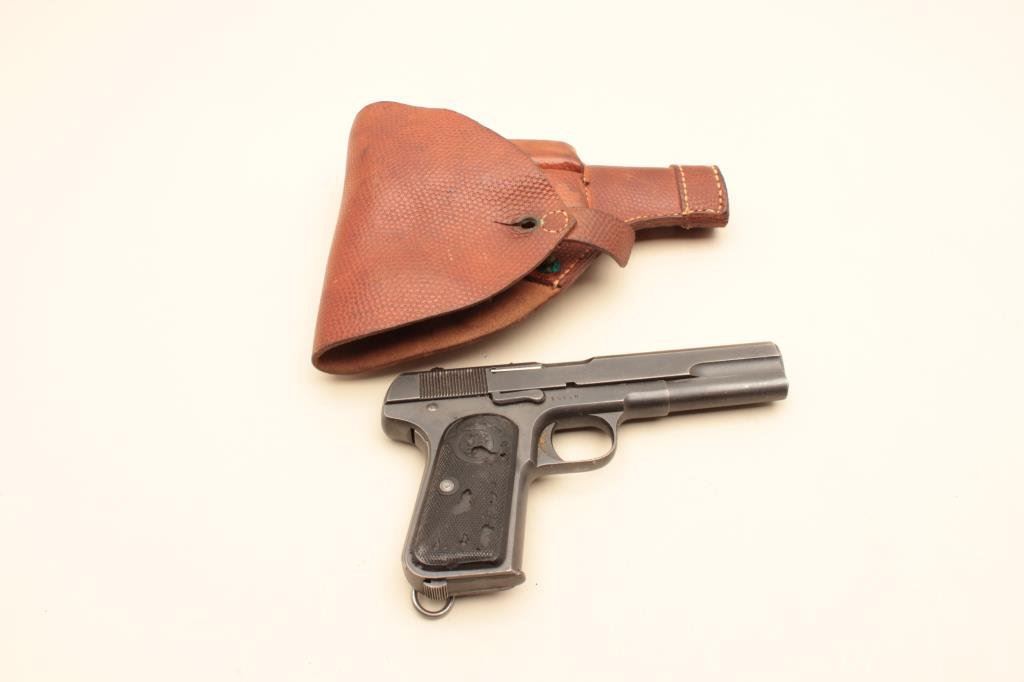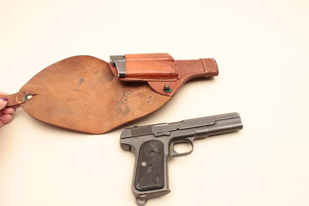 checkered black grips, S/N 15850, in overall good to very good condition with majority of finish remaining, left side of frame is also numbered “I9 No. 550”, fine bore, crisp action, very good markings; grips show some old damage, particularly to the right grip. Accompanied by a leather flap holster and two additional magazines. (C&R/PPT). Est.: $500-$1,000.