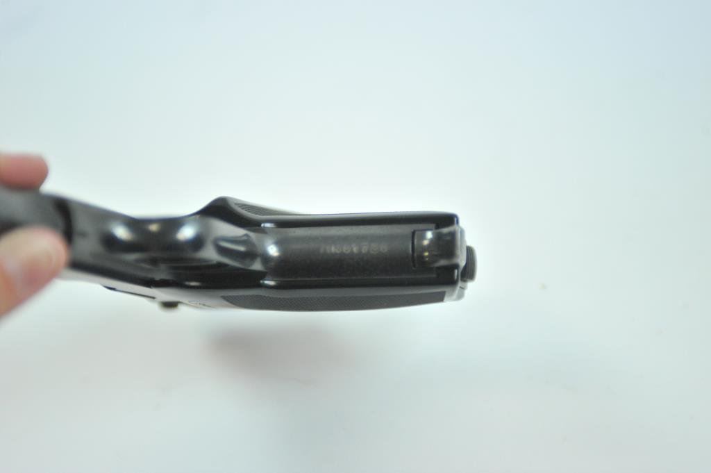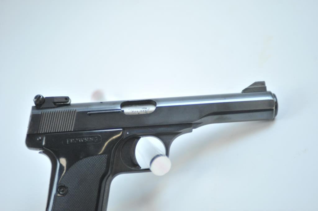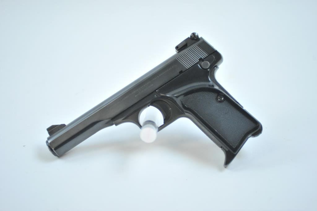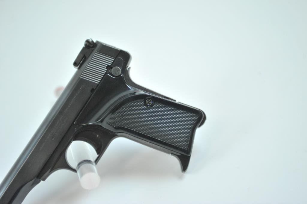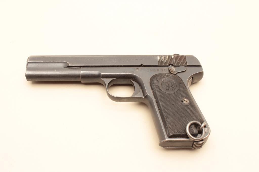 checkered black grips, S/N 15850, in overall good to very good condition with majority of finish remaining, left side of frame is also numbered “I9 No. 550”, fine bore, crisp action, very good markings; grips show some old damage, particularly to the right grip. Accompanied by a leather flap holster and two additional magazines. (C&R/PPT). Est.: $500-$1,000.