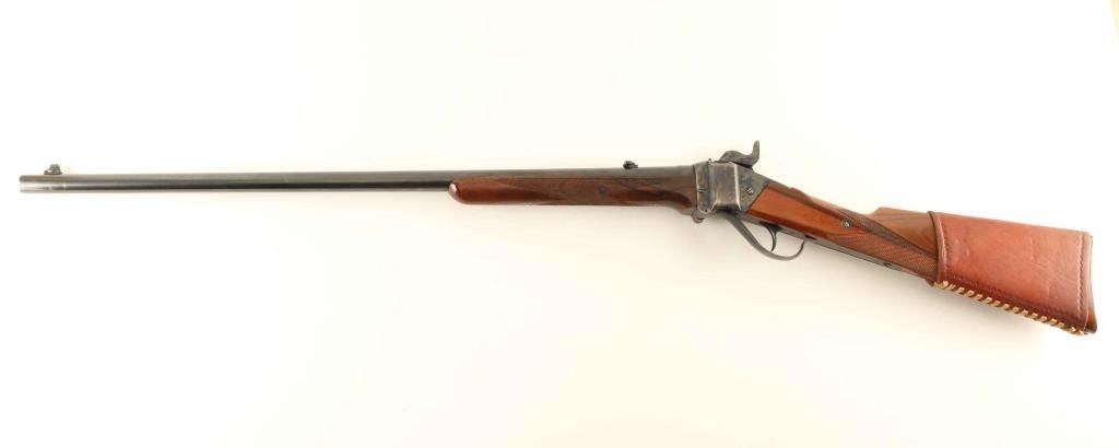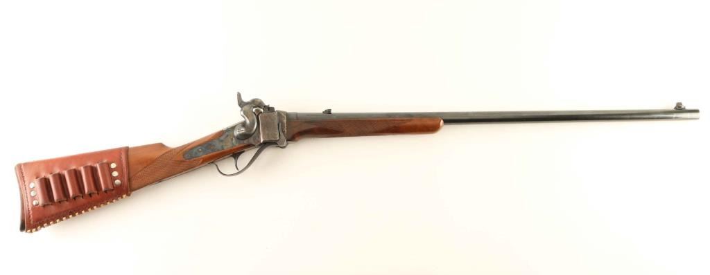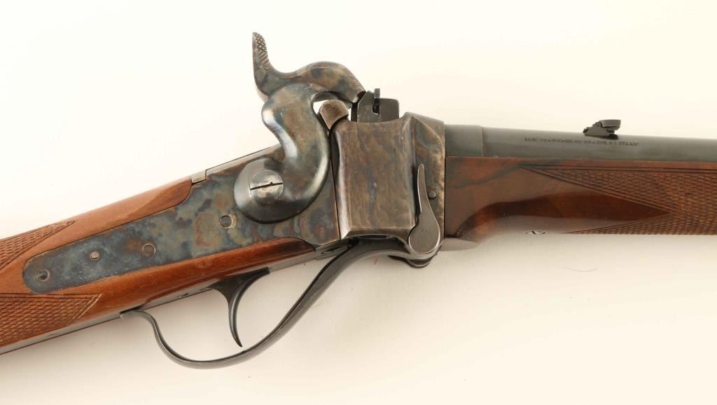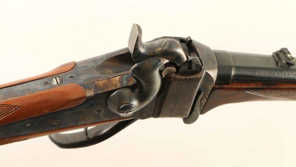 Italian made reproduction of the Sharps Rifle Manufacturing Company Model 1874 falling block single shot rifle chambered in .45-70 Government, manufactured circa 1978. Imported by SILE of New York, N.Y. with import mark on the top of the barrel. Features a blued & case hardened finish, 28 3/4" round barrel, dovetailed Lyman blade front sight with brass bead, flip-up adjustable rear sight, smooth trigger, knurled hammer spur, 'J' shaped finger lever, fancy checkered walnut forend and straight grip shoulder stock with tooled brown leather cartridge carrier & metal carbine buttplate. The barrel is marked "U.S. SHARPS'/RIFLE CO./MERIDEN CONN." Rifle exhibits approximately 95% of it's original finish showing light muzzle wear and some scattered handling wear. Action is smooth, the bore is very good and the wood stocks are very good. Condition is NRA Very Good to Excellent. ***Modern Firearm***
