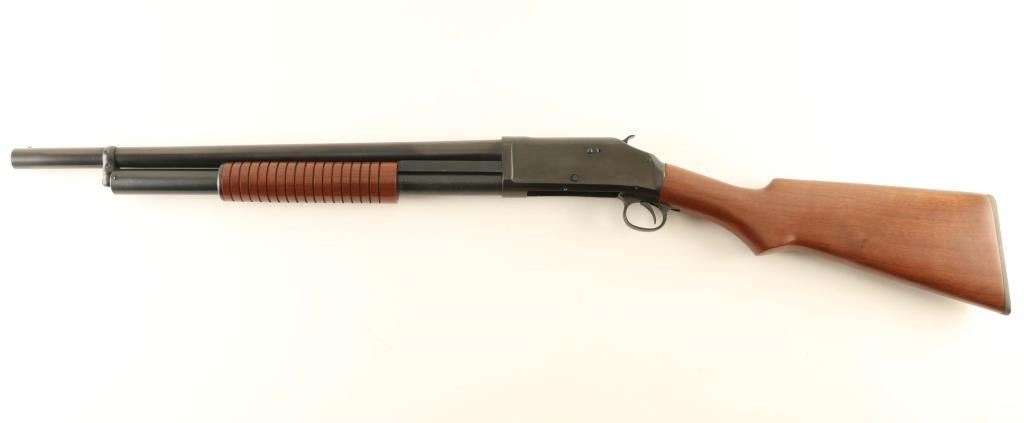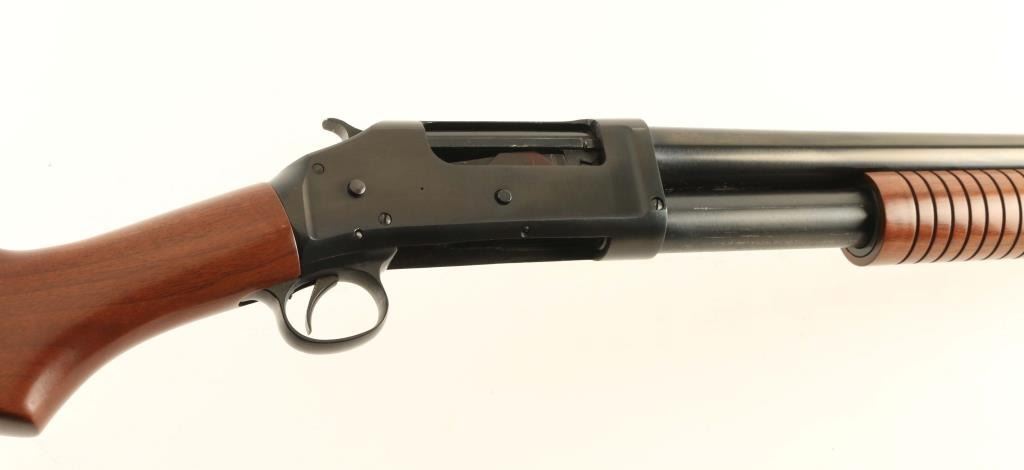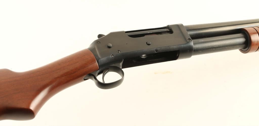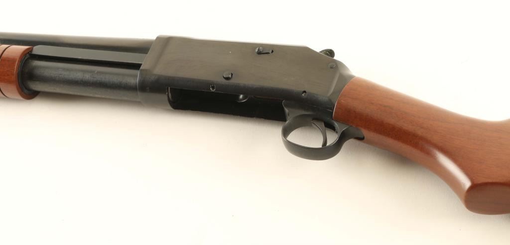 Chinese made copy of the Winchester 1897 slide action repeating shotgun chambered for 2 3/4" 12 gauge shells. Features a blued finish, 20 5/16" cylinder bore barrel, brass bead front sight, 5 round tube magazine, smooth trigger, exposed hammer with knurled spur, single action bar, grooved walnut slide handle, and smooth semi-pistol grip shoulder stock with checkered polymer buttplate & 14” LOP. Shotgun retains approximately 97% of its original blued finish showing some slide wear on the rear of the magazine tube and some scattered pin prick pitting towards the front of the magazine tube. Action is sound, the bore appears excellent but dirty and the wood stocks are fine. Condition is near NRA Very Good. ***Modern Firearm***