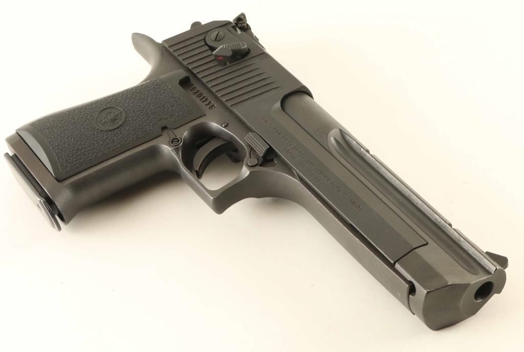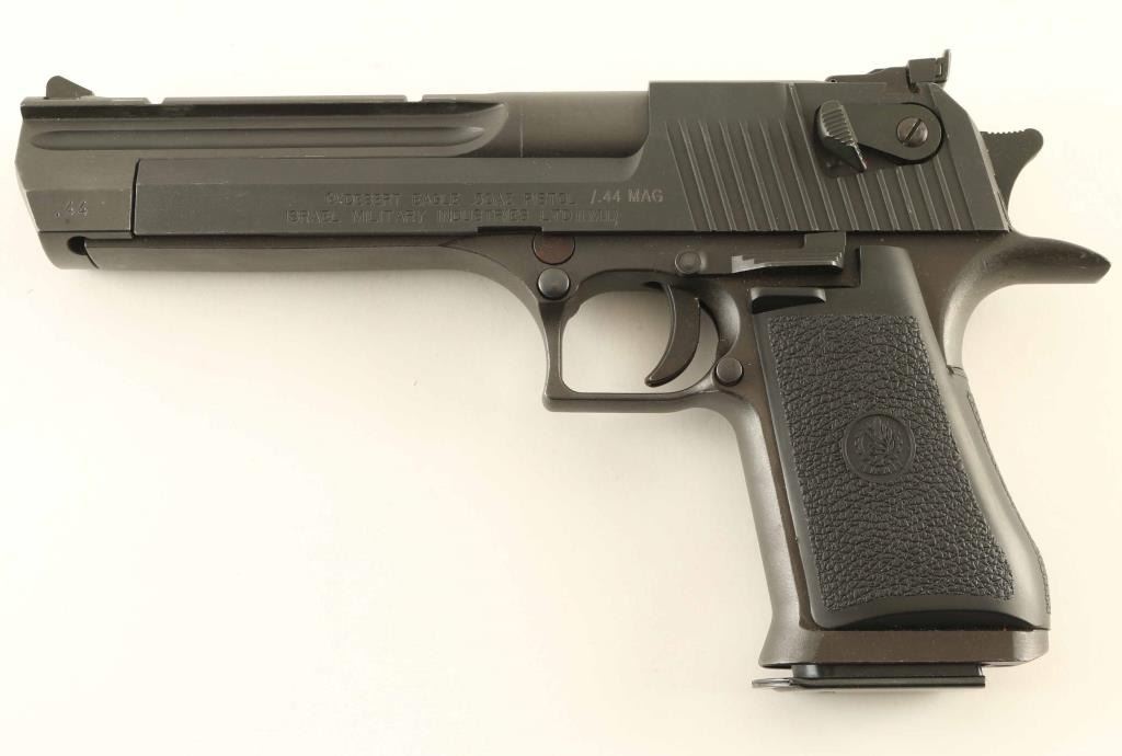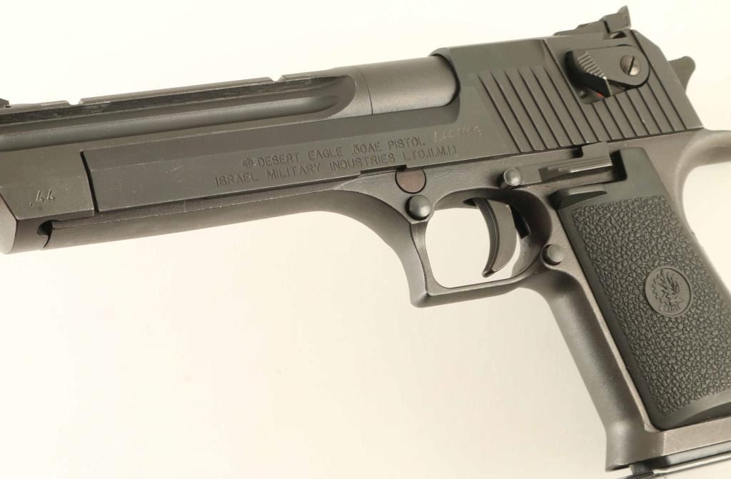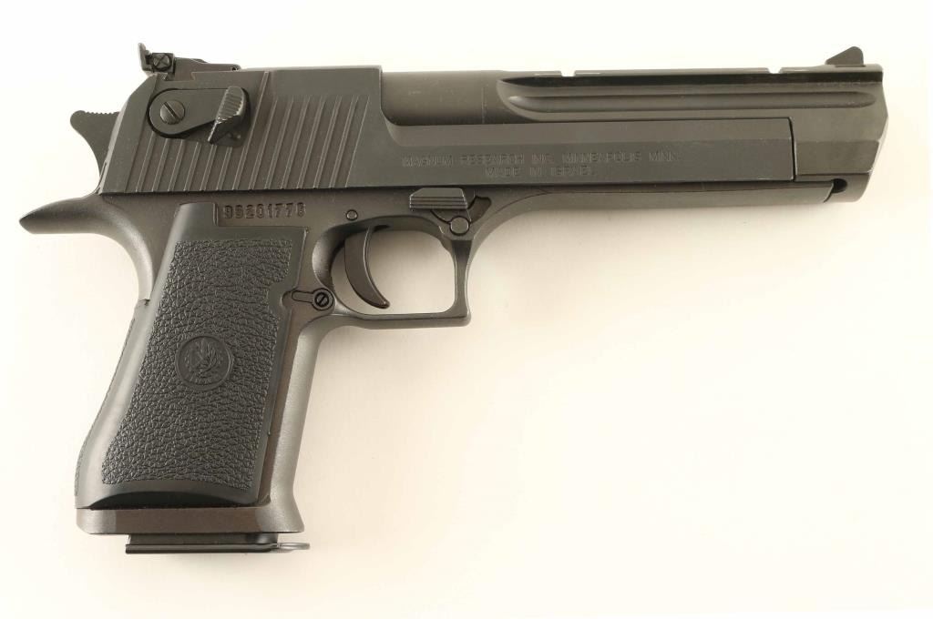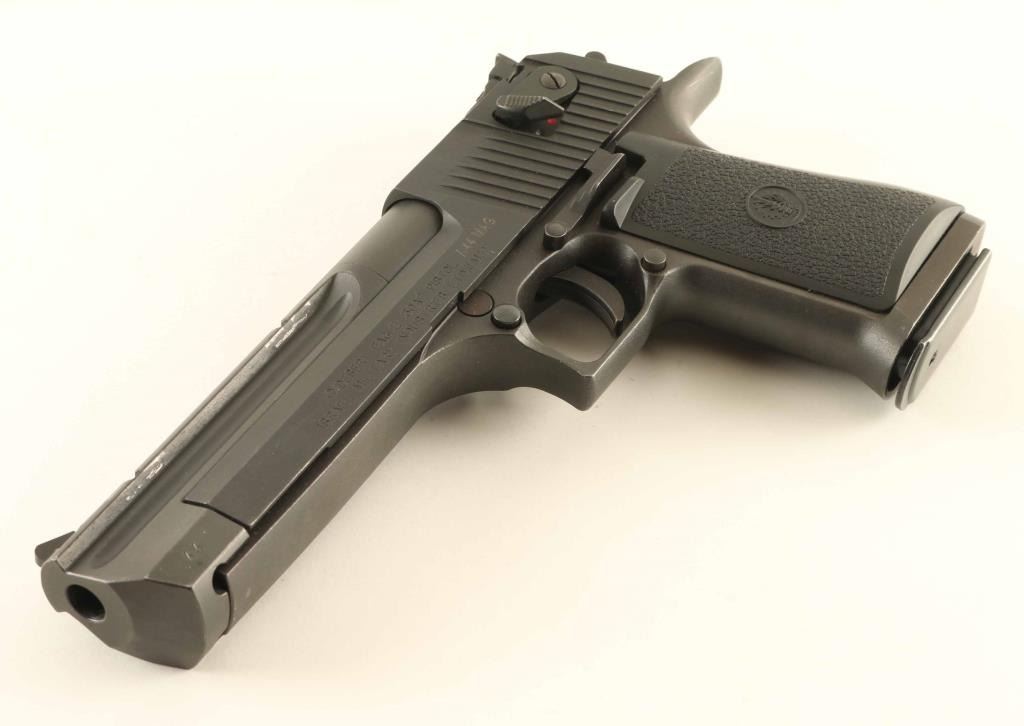 Israeli semiautomatic pistol imported by Magnum Research, Minneapolis MN. Features matte black finish, black plastic grips, 6.5" barrel with integral scope rail, adjustable sights, single action trigger, slide mounted manual safety, push button magazine release. Bore is excellent condition. Retains 95% finish with small spots of bare metal showing on many sharp edges. Includes (1) magazine. Condition is NRA Excellent *** Modern Firearm ***